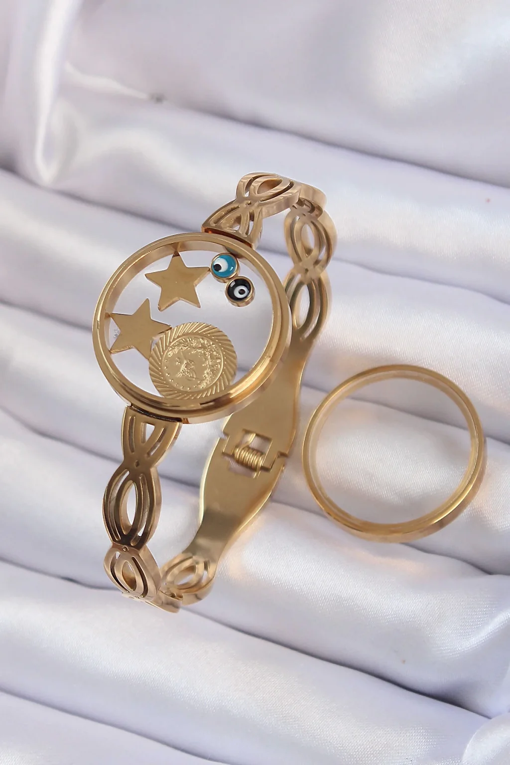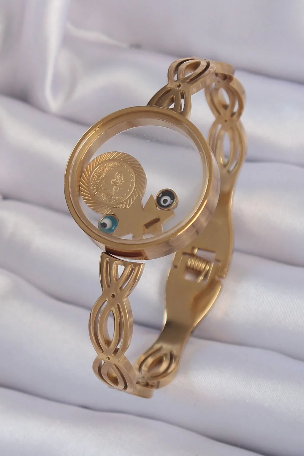 316L Çelik Altın Renk İçi Nazar Boncuk ve Yıldız Figürlü Açılabilir Fanus Kelepçe