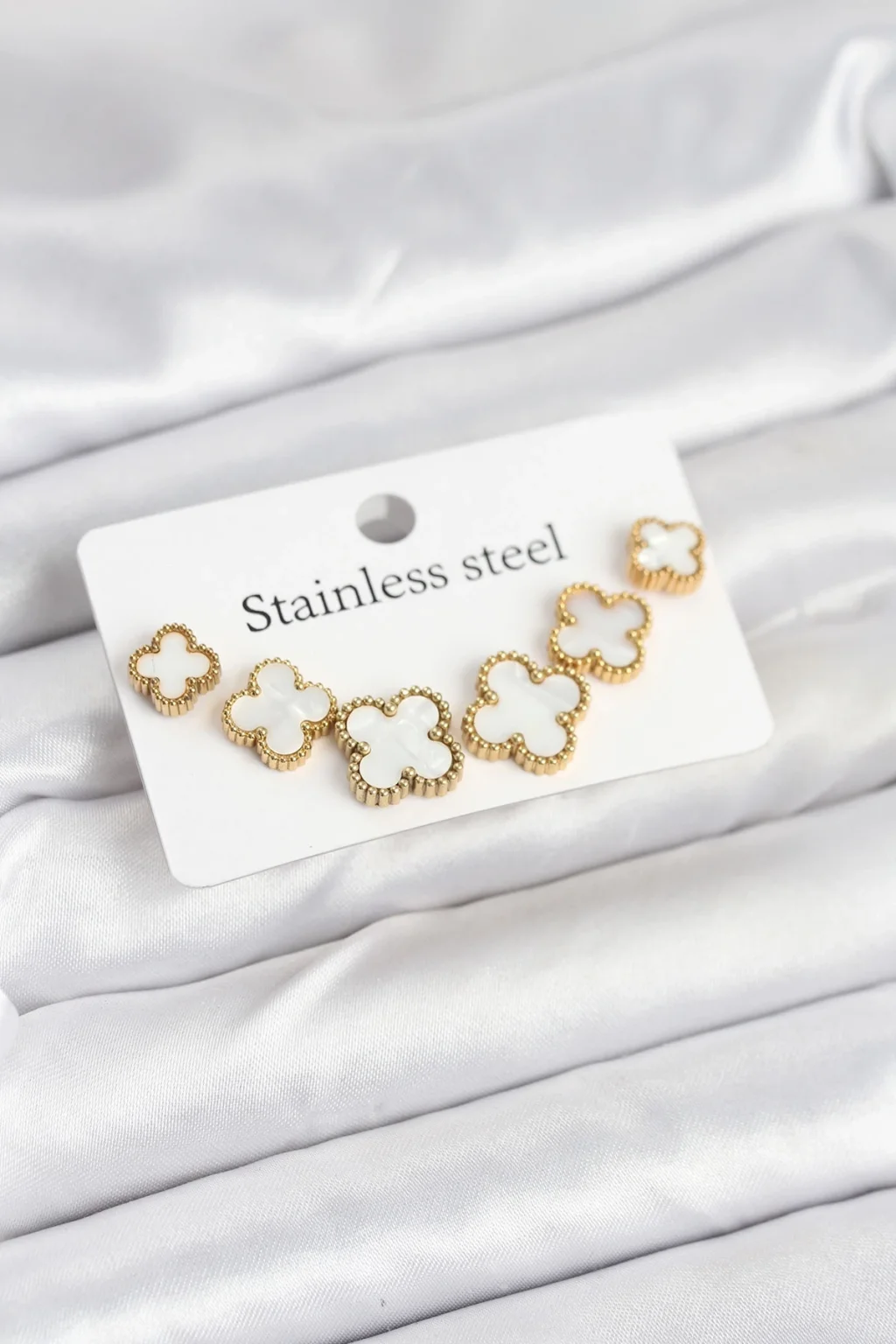 316L Çelik Gold Beyaz Renk 3 Boy Yonca Küpe Seti