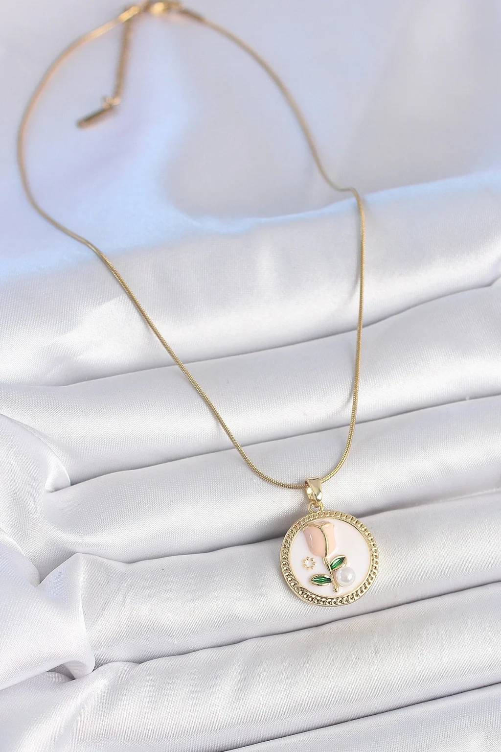 316L Çelik Gold Renk Beyaz Mineli İncili Çiçek İşlemeli Portre Model Kadın Kolye