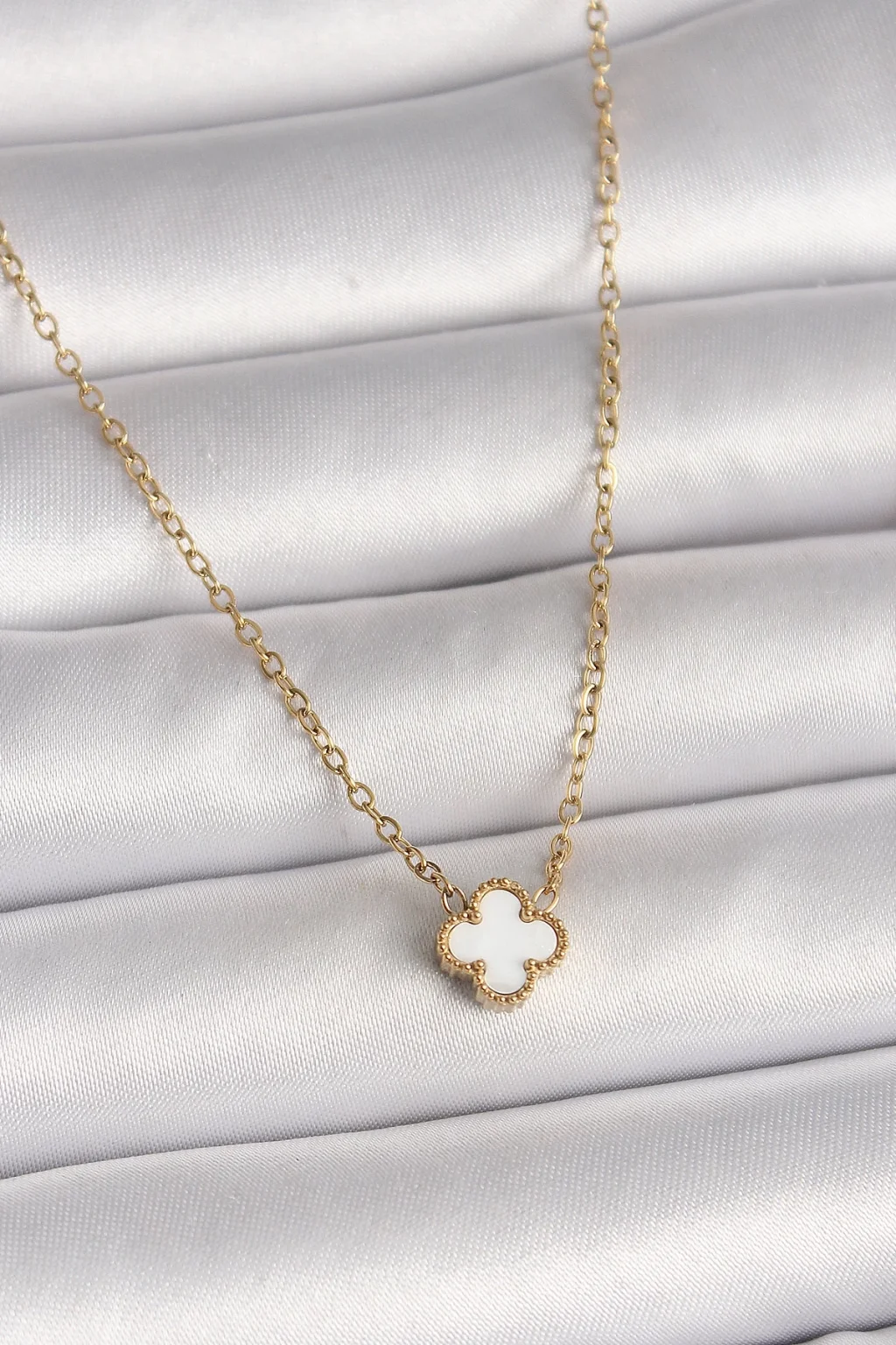 316L Çelik Gold Renk Beyaz Yonca Model Kadın Kolye