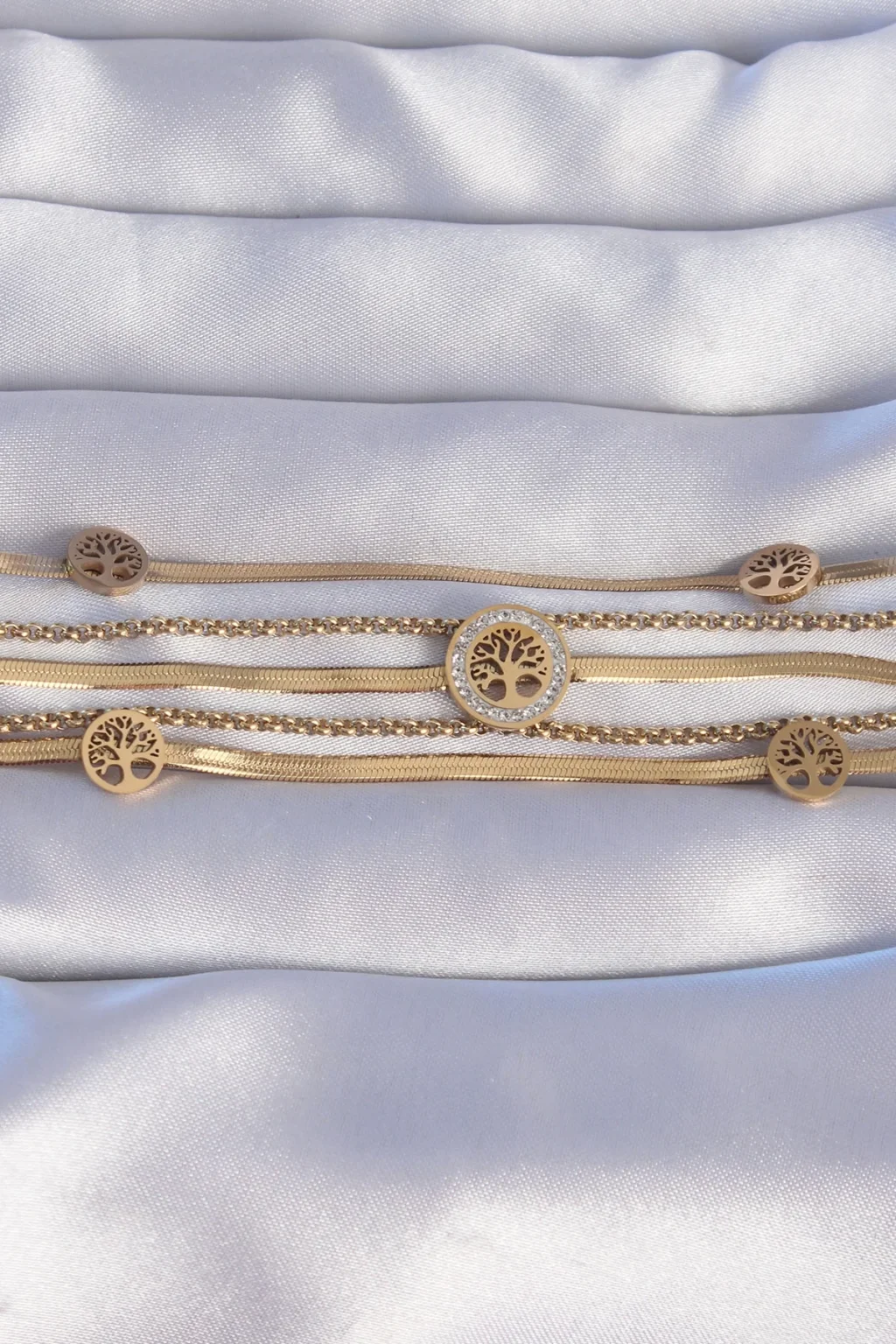 316L Çelik Gold Renk İtalyan Zincir Detaylı Zirkon Taşlı Yaşam Ağacı Tasarımlı Çoklu Bileklik
