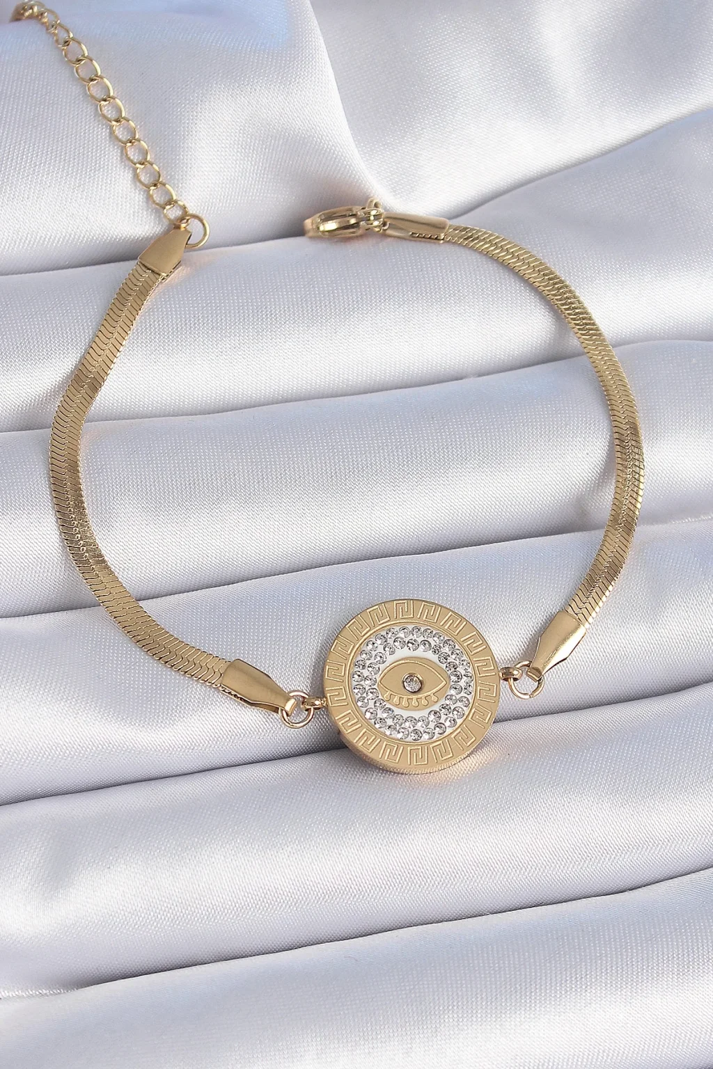 316L Çelik Gold Renk İtalyan Zincir Zirkon Taşlı Göz İşlemeli Madalyon Model Kadın Bileklik