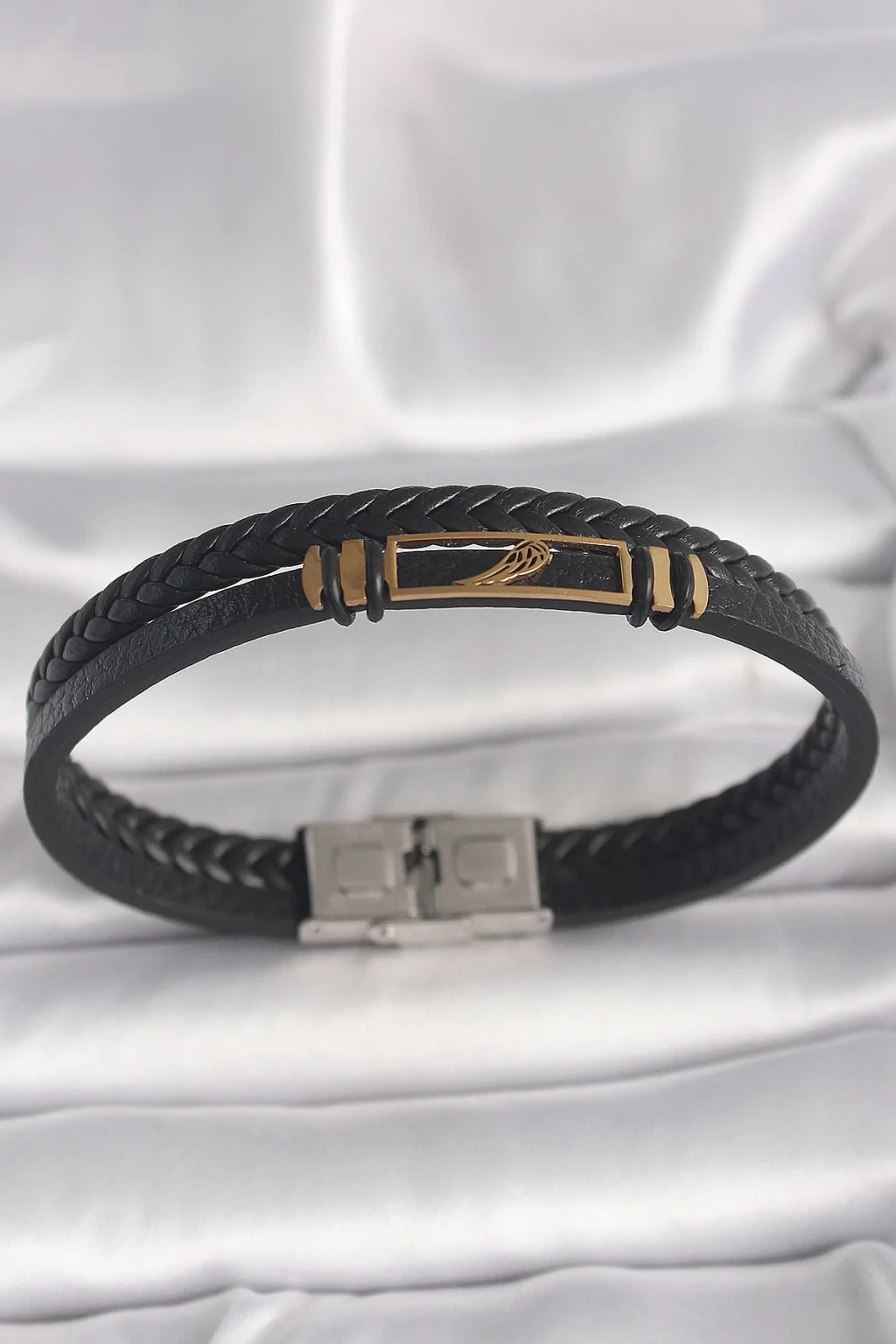 316L Çelik Gold Renk Kanat Aksesuarlı Siyah Burgu Model Deri Kordon Erkek Bileklik