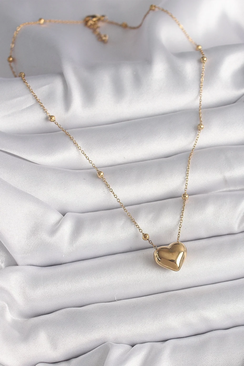 316L Çelik Gold Renk Topçuk Detaylı Zincir Kalp Model Kadın Kolye