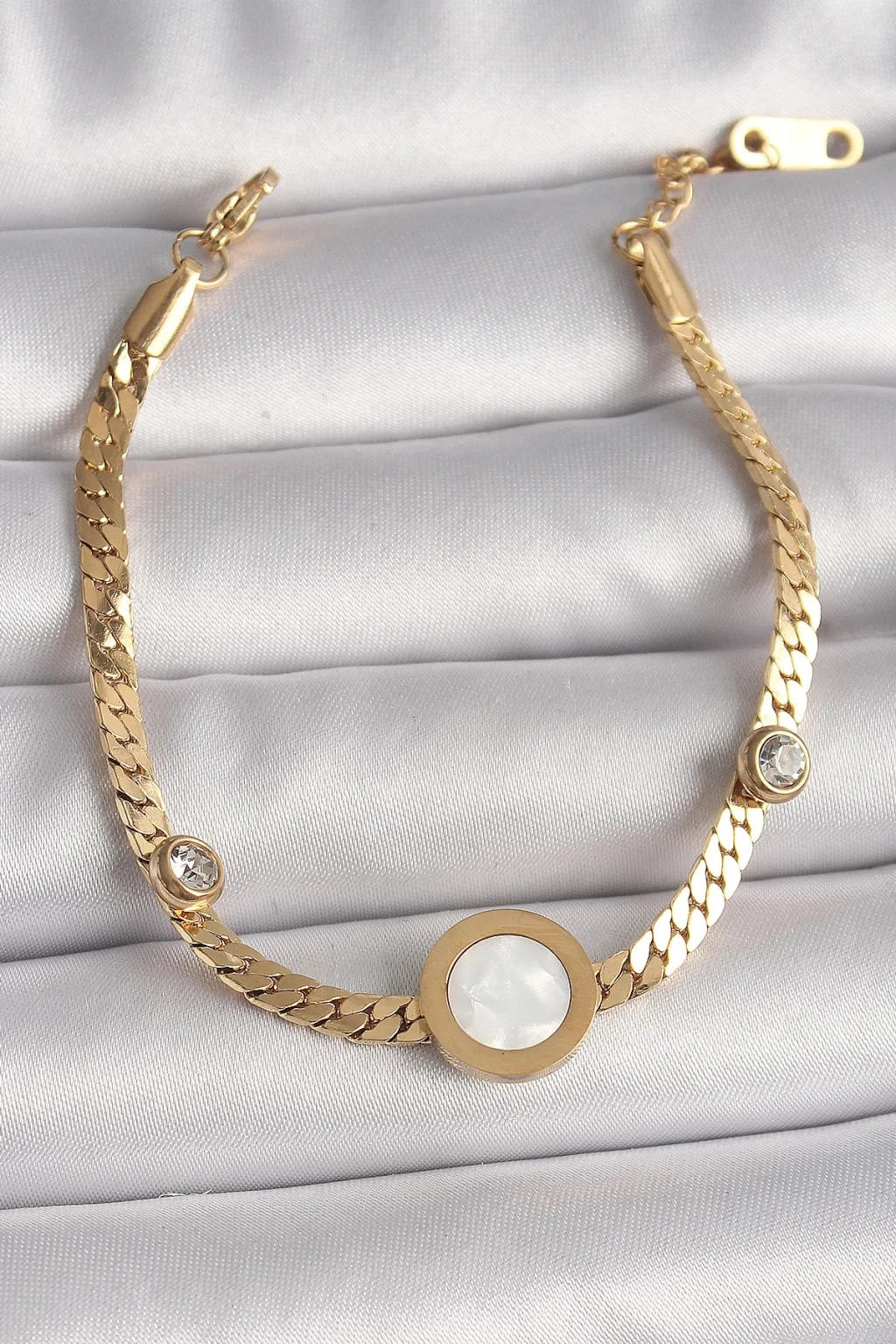 316L Çelik Gold Renk Yassı Zincir Model Zirkon Taş Detaylı Beyaz Mineli Madalyon Model Kadın Bileklik