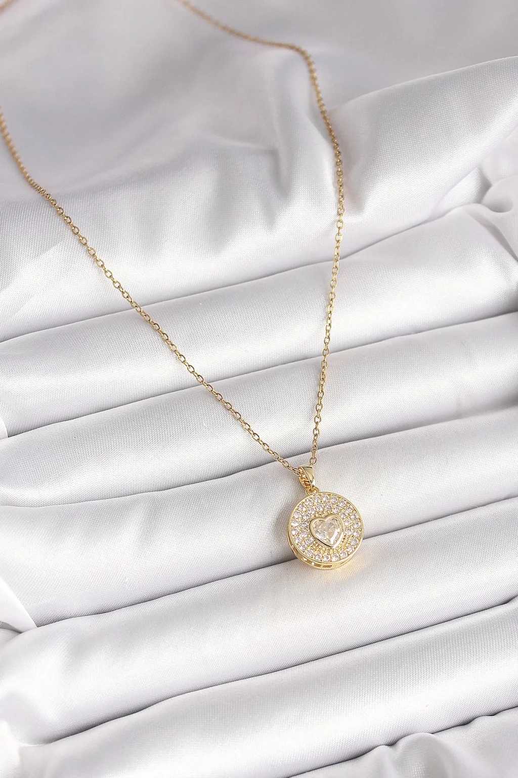 316L Çelik Gold Renk Zincir Madalyon Zirkon Taşlı Kalp Model Kadın Kolye