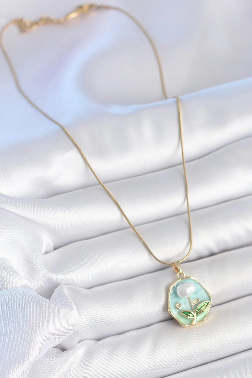 316L Çelik Gold Renk Zincir Mavi Çiçek İşlemeli İnci İşlemeli Portre Model Kadın Kolye