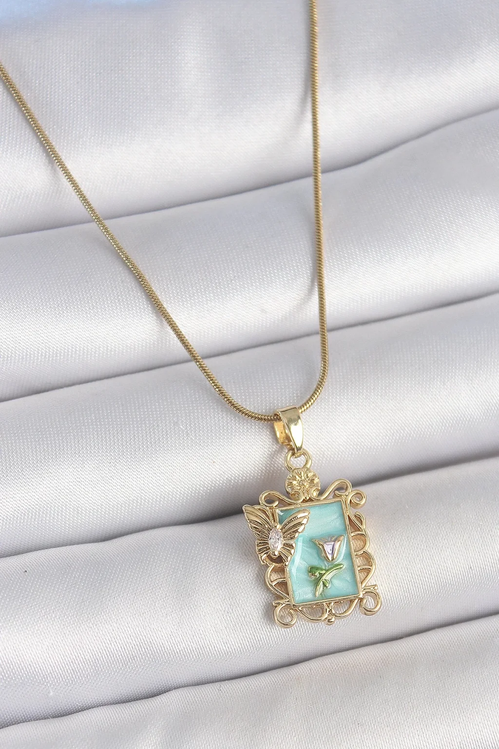 316L Çelik Gold Renk Zincir Mavi Mineli Çiçek İşlemeli Zirkon Taşlı Kelebek Detay Portre Model Kadın Kolye