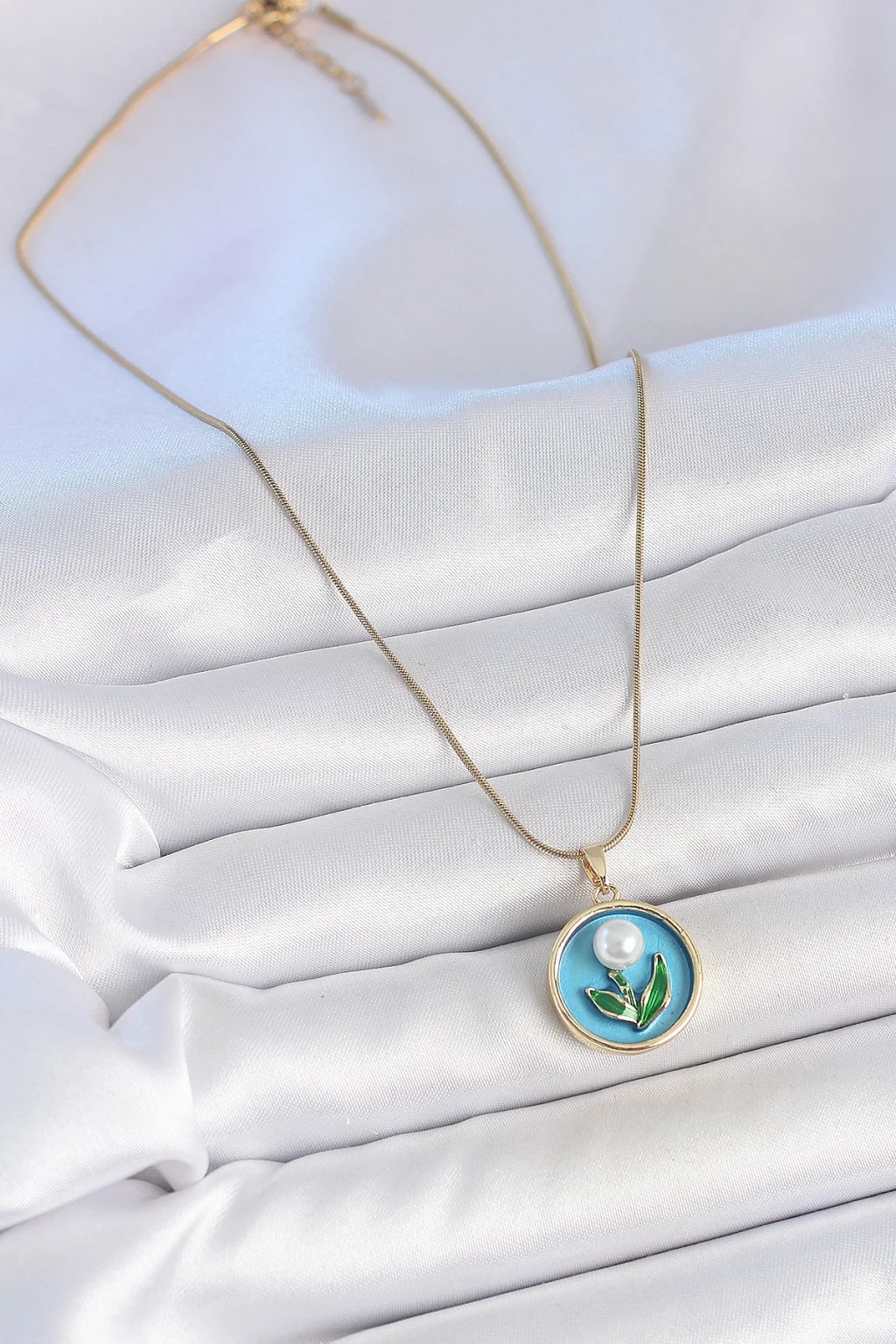 316L Çelik Gold Renk Zincir Mavi Mineli İncili Çiçek İşlemeli Portre Model Kadın Kolye