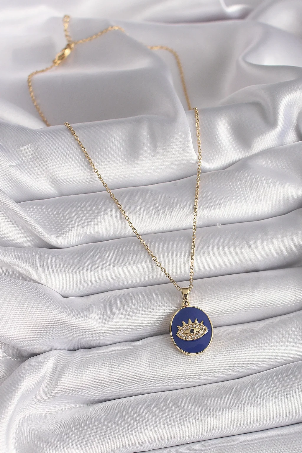 316L Çelik Gold Renk Zincir Mavi Mineli Zirkon Taşlı Göz İşleme Kadın Kolye