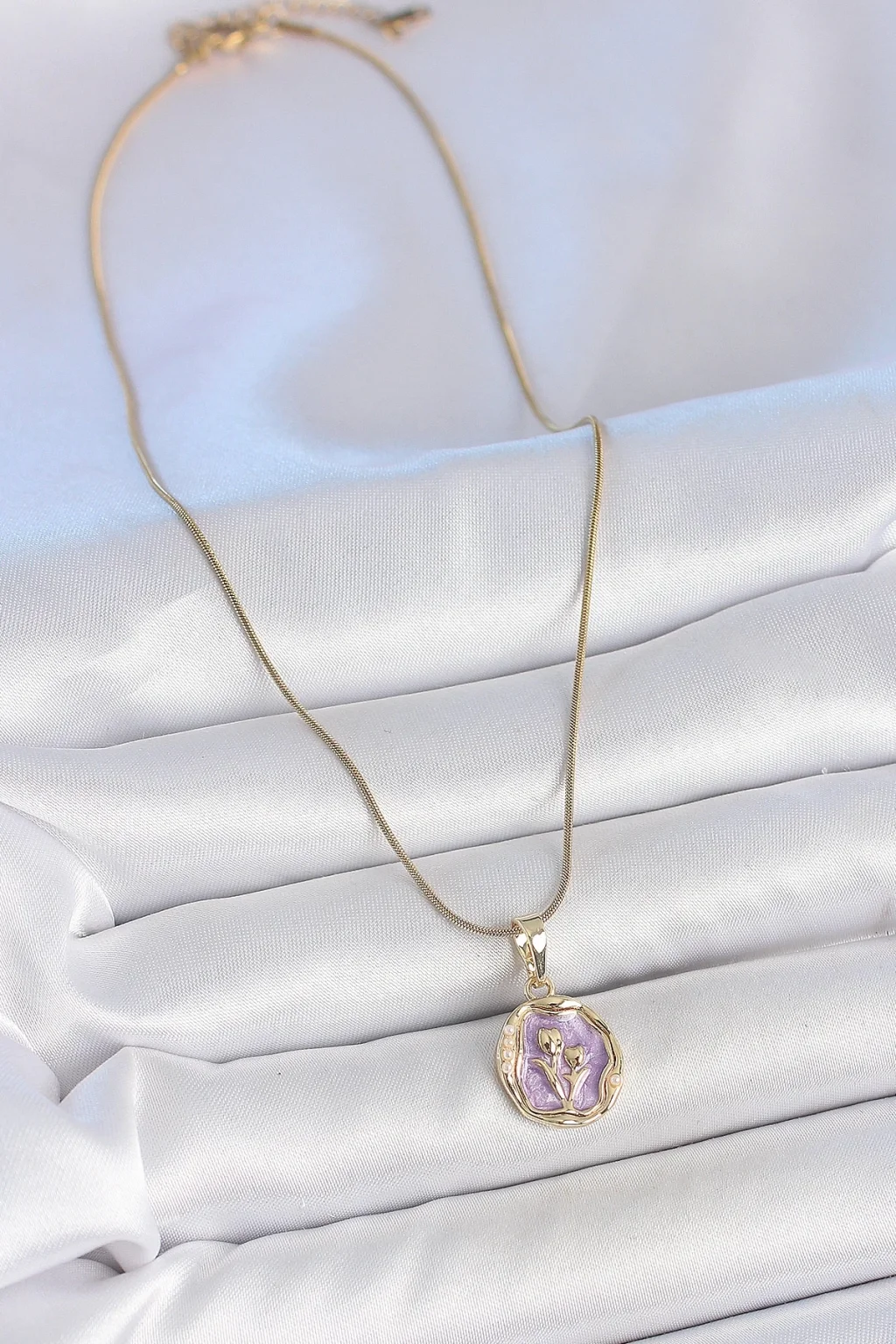 316L Çelik Gold Renk Zincir Mor Mineli Çiçek İşlemeli Portre Model Kadın Kolye
