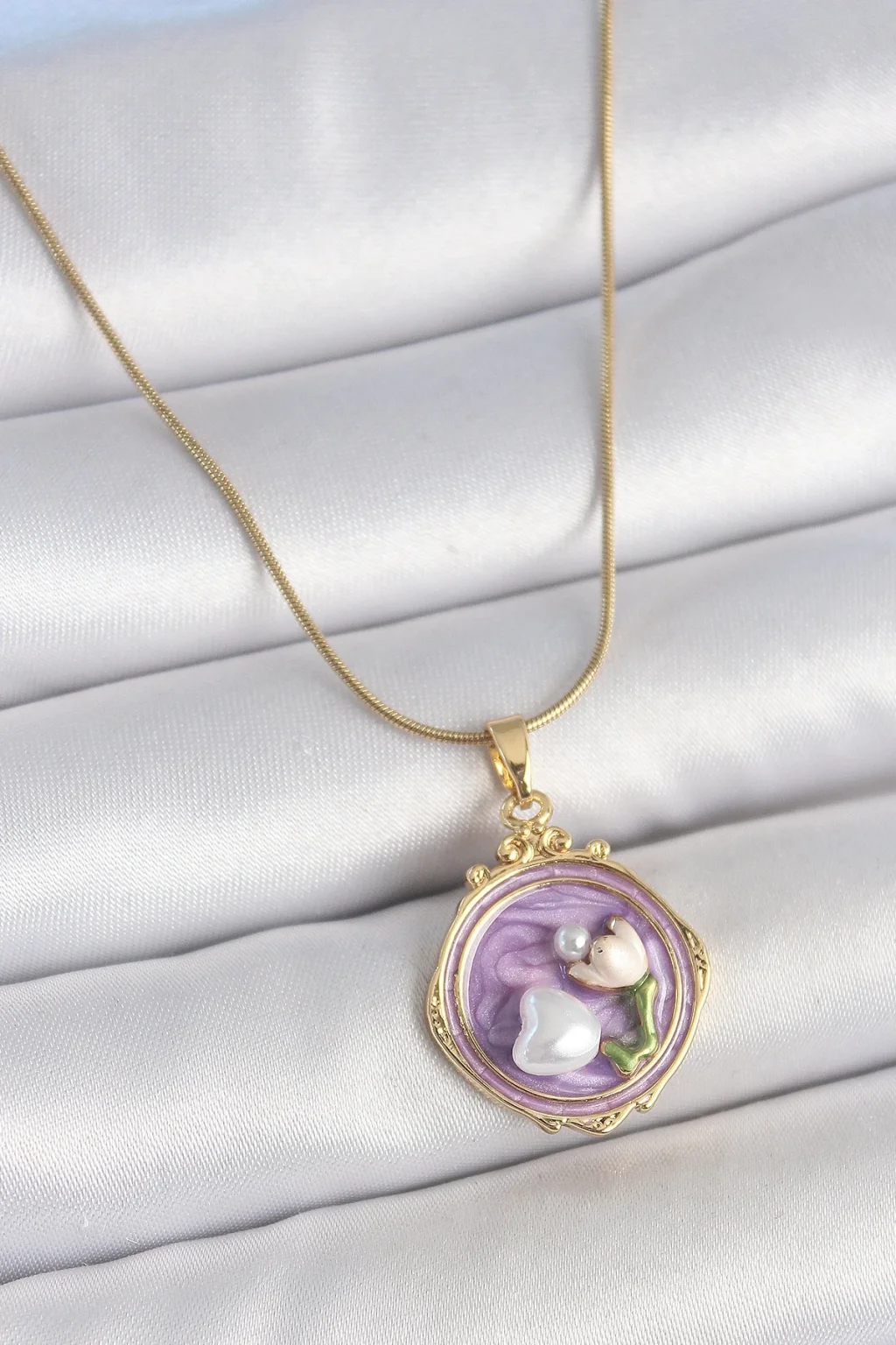 316L Çelik Gold Renk Zincir Mor Mineli İncili Çiçek İşlemeli Portre Model Kadın Kolye