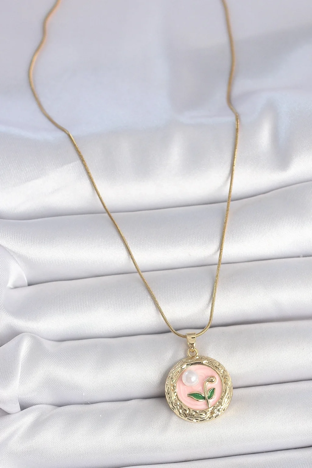 316L Çelik Gold Renk Zincir Pembe Çiçek İşlemeli inci Detay Portre Model Kadın Kolye