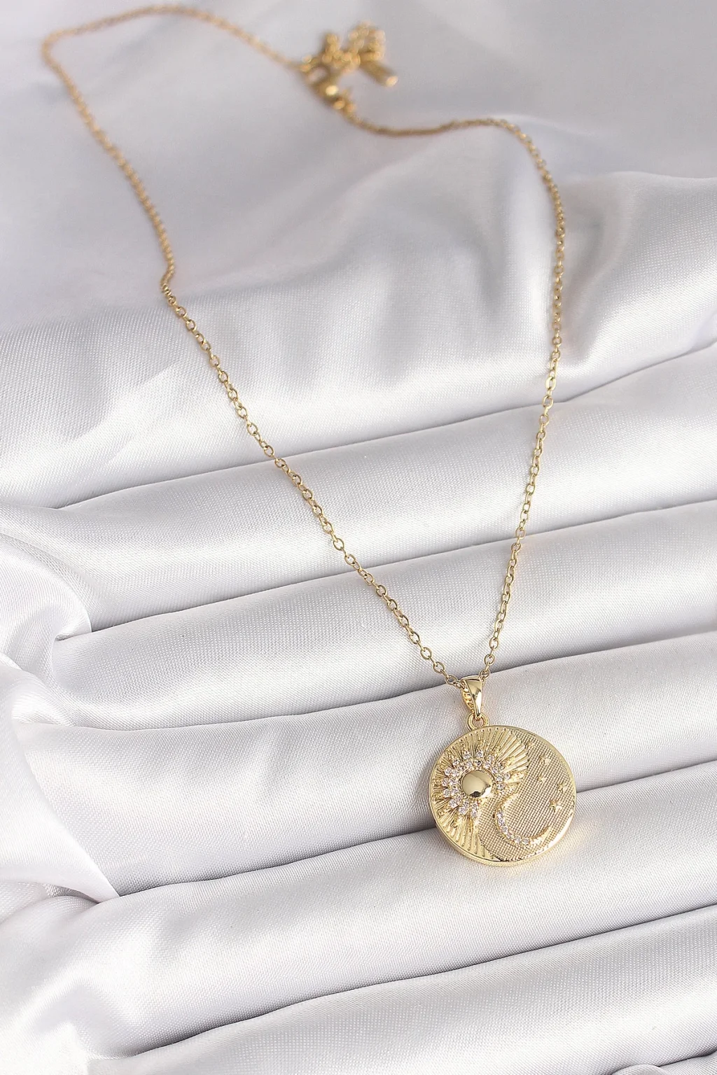 316L Çelik Gold Renk Zincir Zirkon Taşlı Ay Güneş İşlemeli Madalyon Model Kadın Kolye