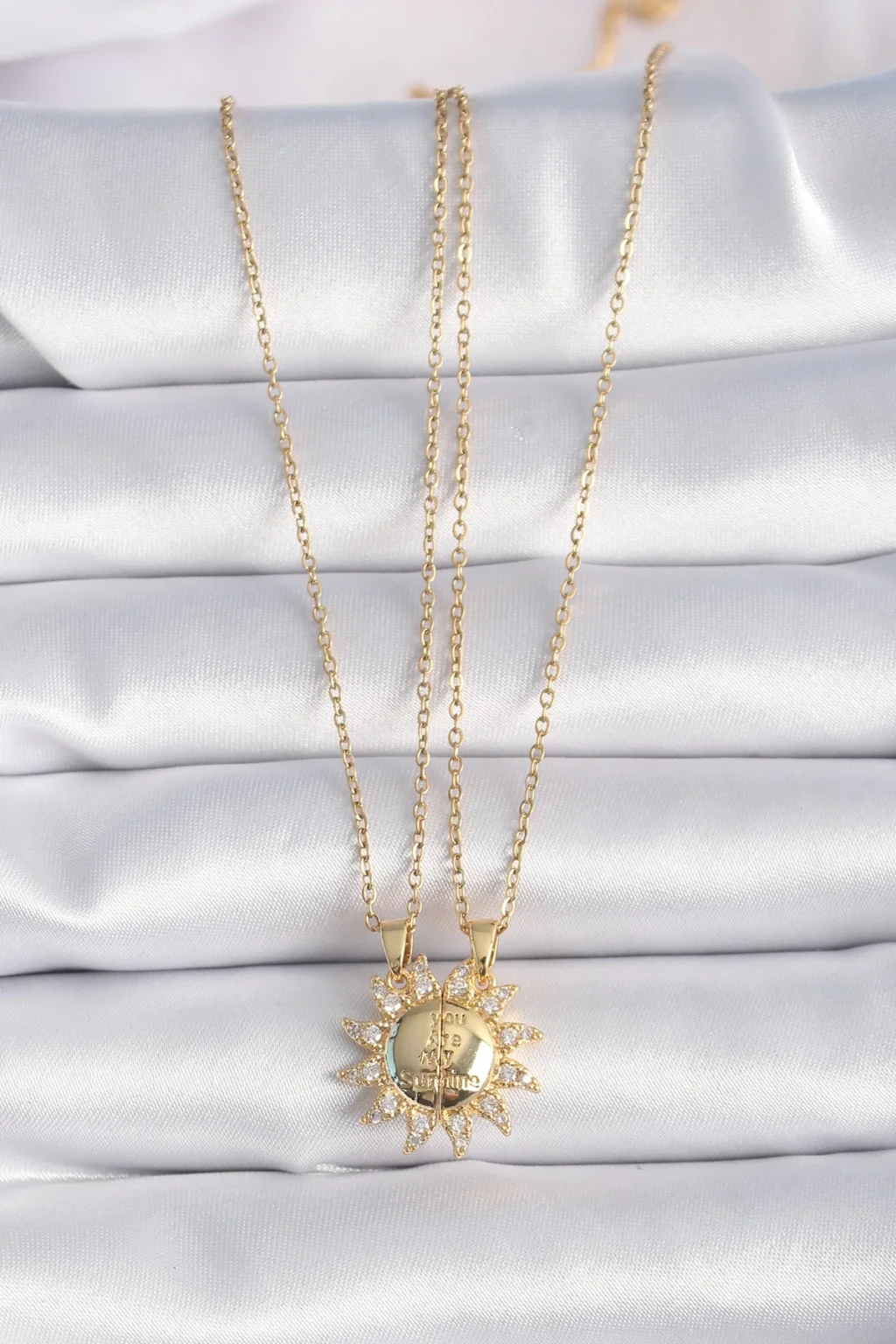 316L Çelik Gold Renk Zirkon Taşlı Güneş Model İşleme Yazı Detay Arkadaş Kolyesi