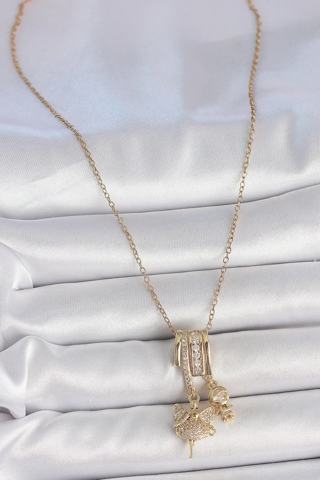 316L Çelik Gold Renk Zirkon Taşlı Sallantı Melek Figür Charm Kadın Kolye
