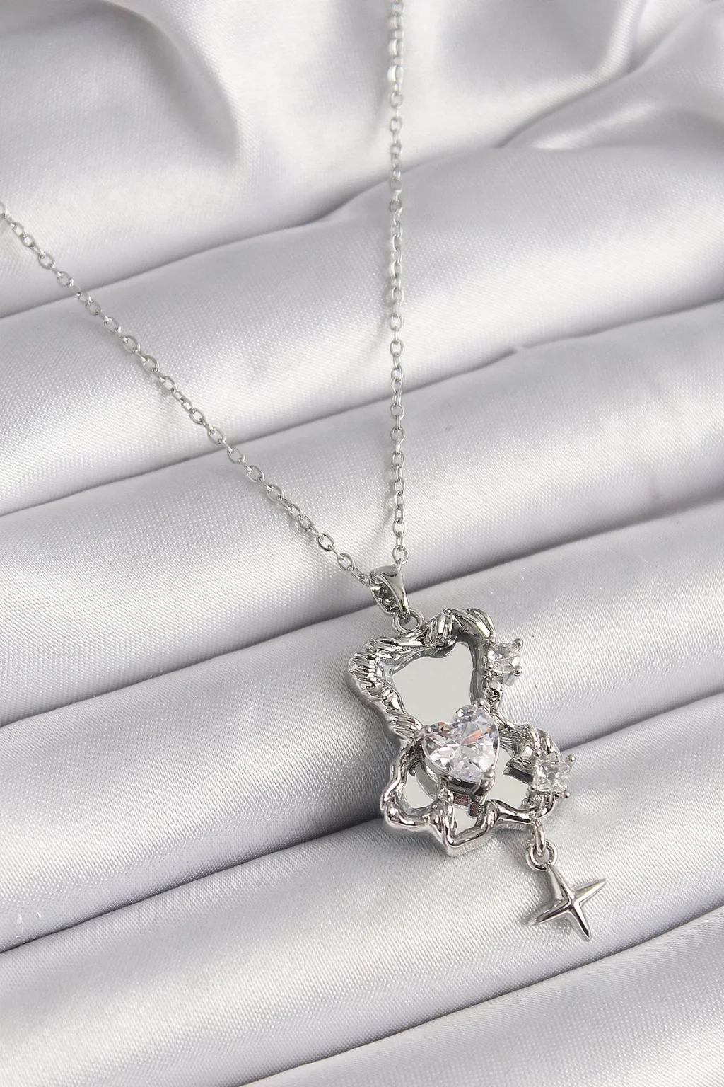 316L Çelik Gümüş Renk Ayna Ayıcık Model Zirkon Taşlı Kalp Detay Kadın Kolye
