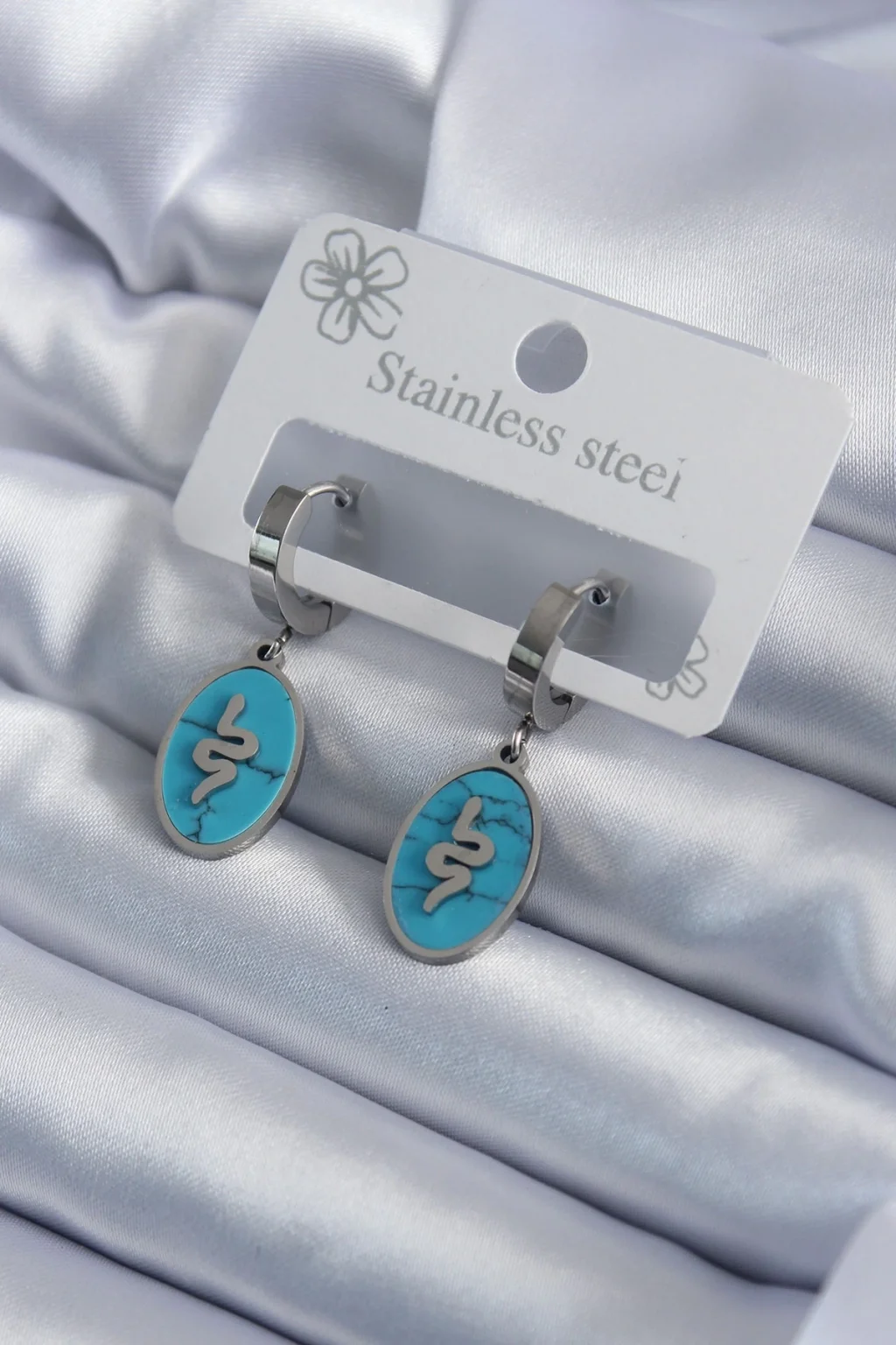 316L Çelik Gümüş Renk Oval Mavi Taşlı Yılan Figür Kadın Küpe