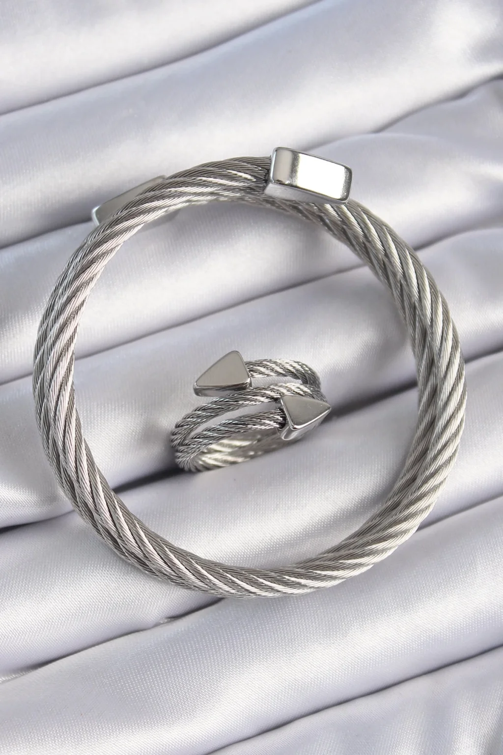 316L Çelik Gümüş Renk Sarmal Model Erkek Bileklik Yüzük Kombini