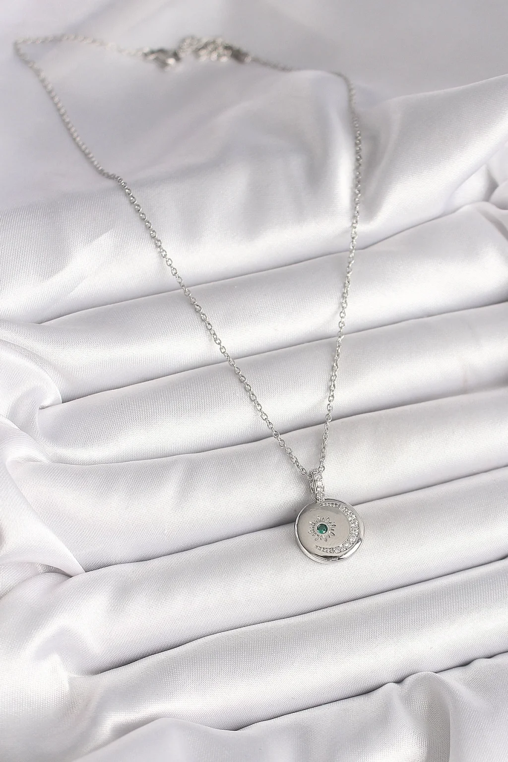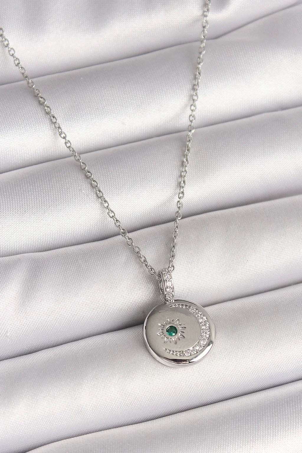 316L Çelik Gümüş Renk Zincir Madalyon Zirkon Taşlı İşlemeli Hilal Yıldız Model Kadın Kolye
