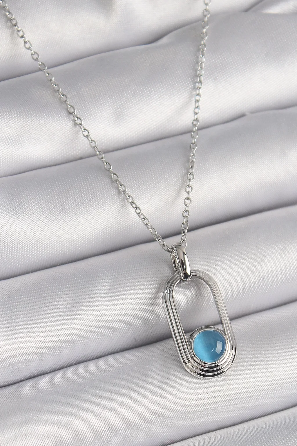 316L Çelik Gümüş Renk Zincir Mavi Kedi Göz Model Kadın Kolye