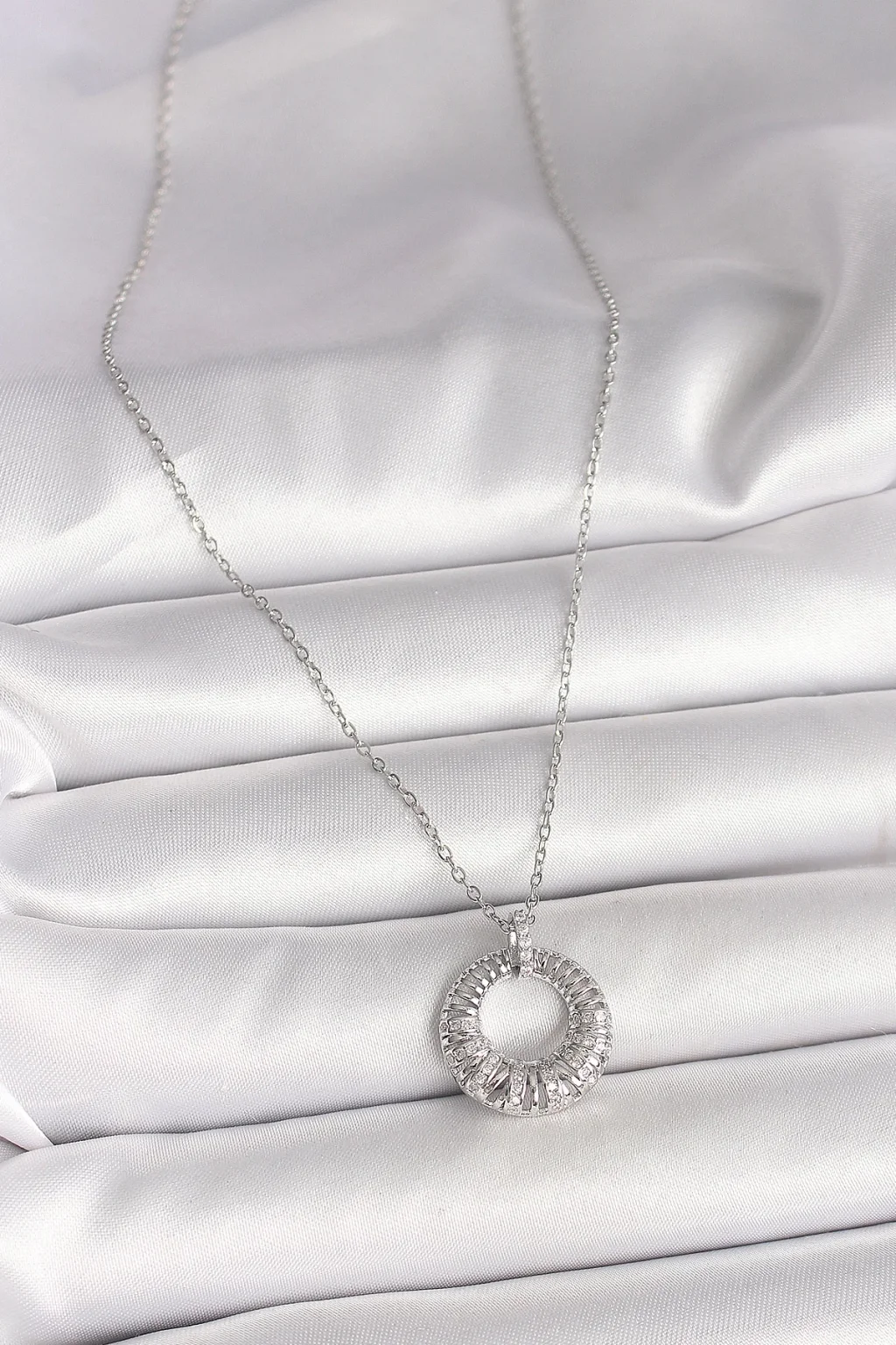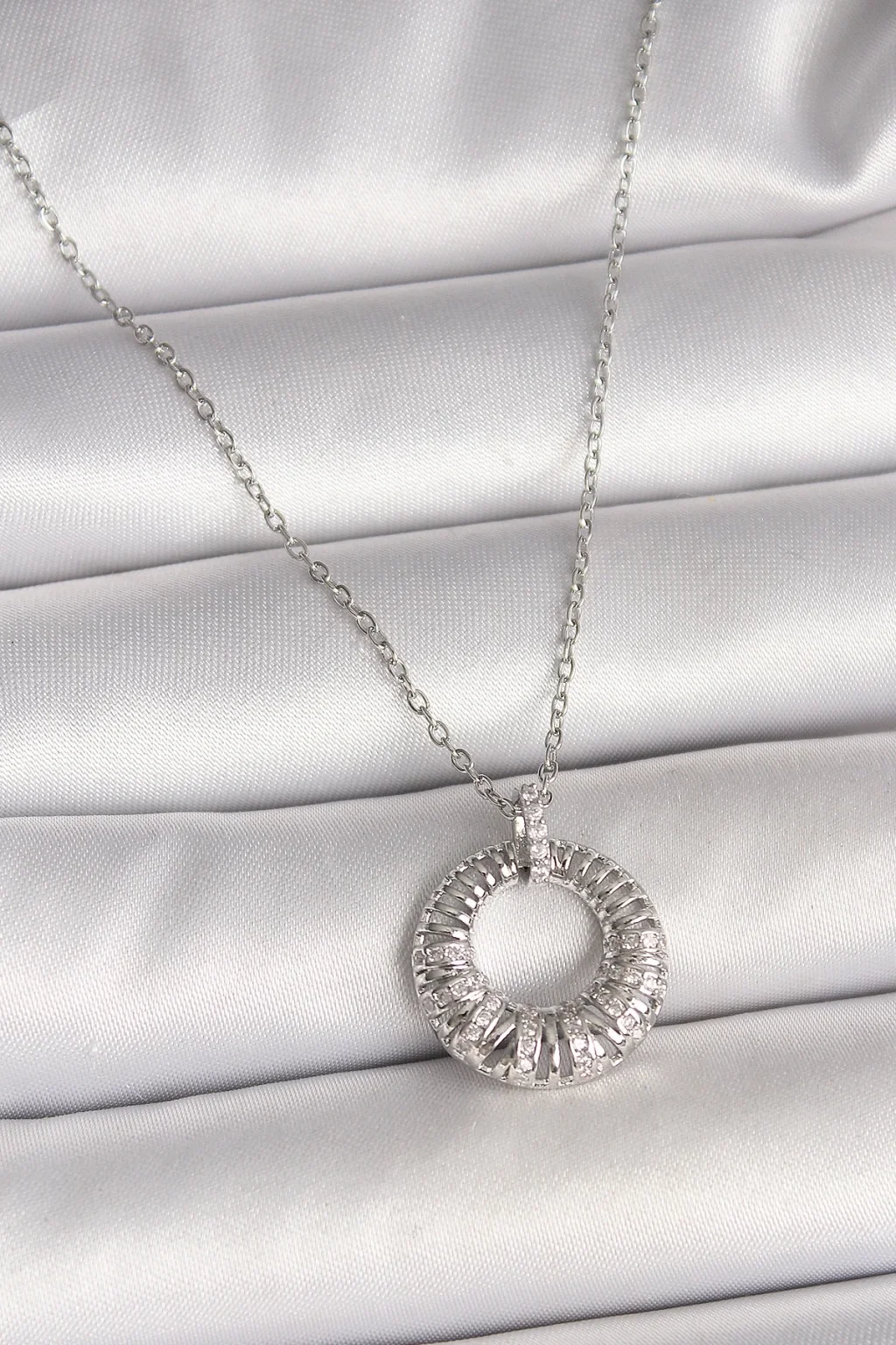 316L Çelik Gümüş Renk Zincir Zirkon Taş İşlemeli Daire Model Kadın Kolye