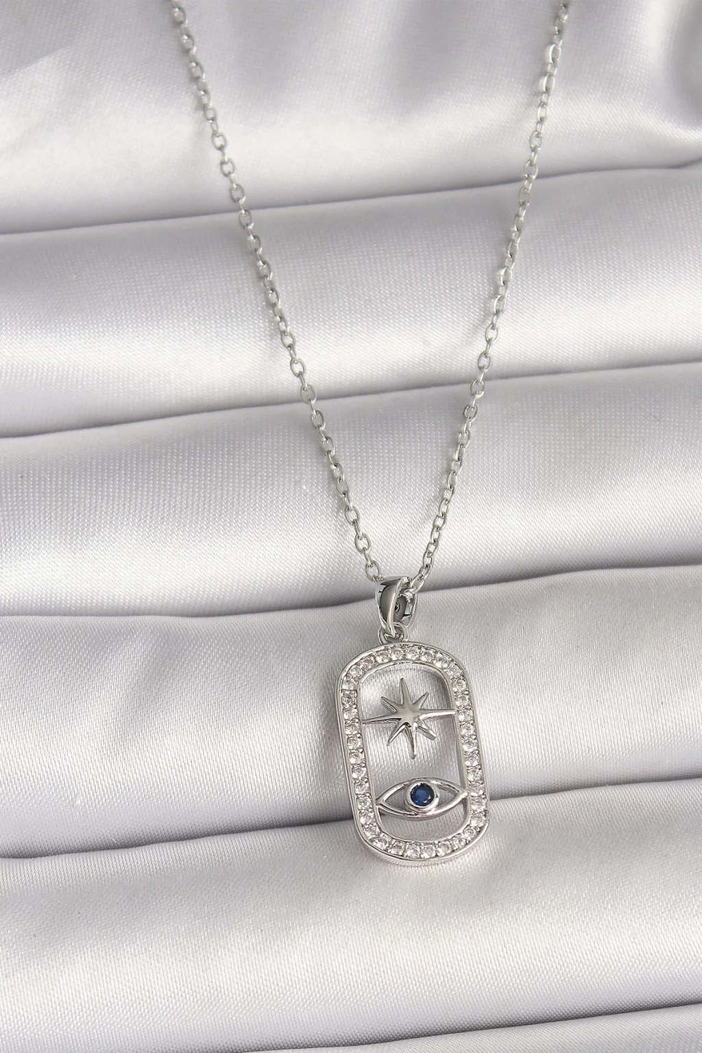 316L Çelik Gümüş Renk Zincir Zirkon Taşlı Göz Yıldız Model Kadın Kolye
