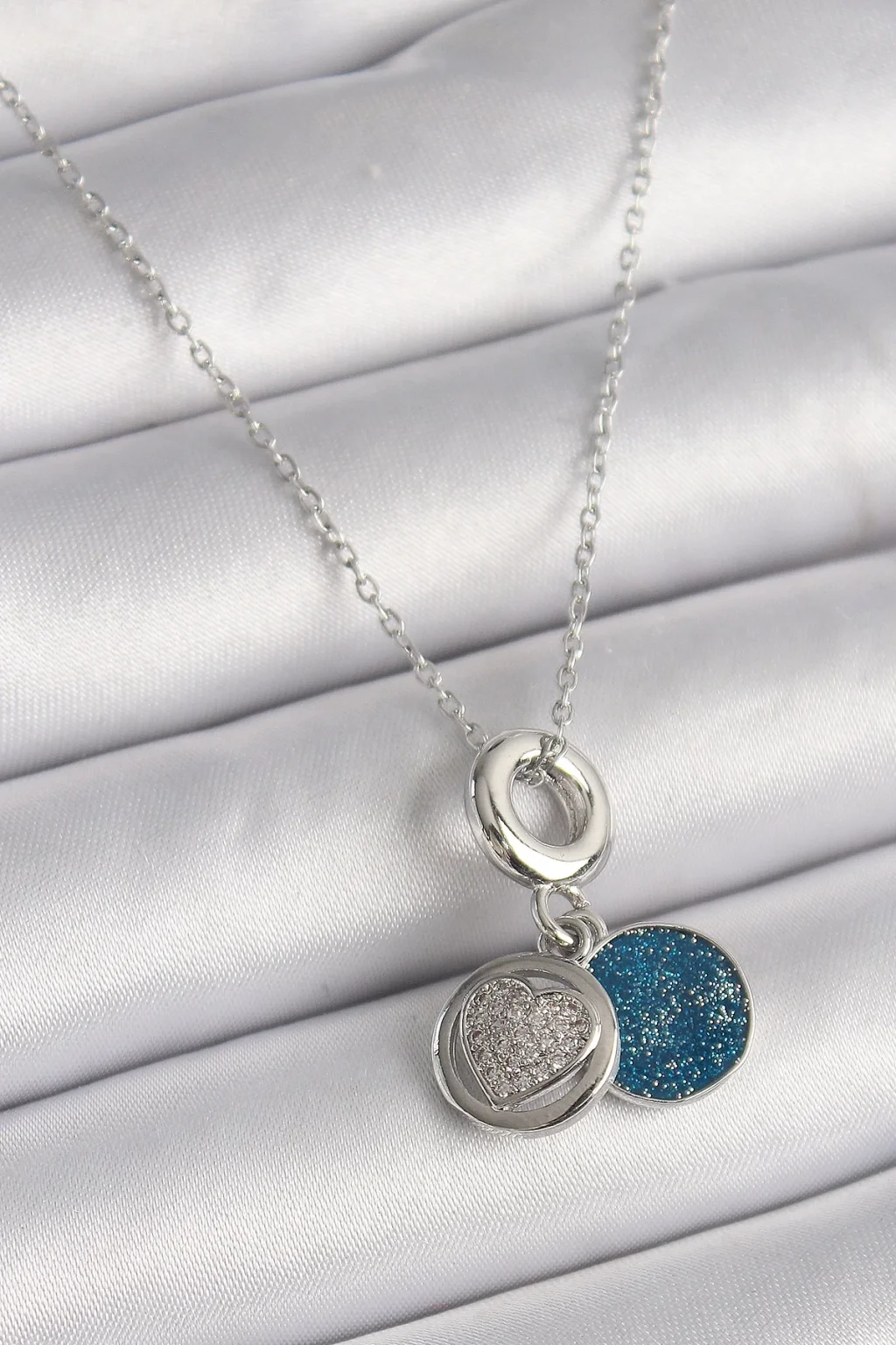 316L Çelik Gümüş Renk Zincir Zirkon Taşlı İşleme Mavi Simli Kadın Kolye