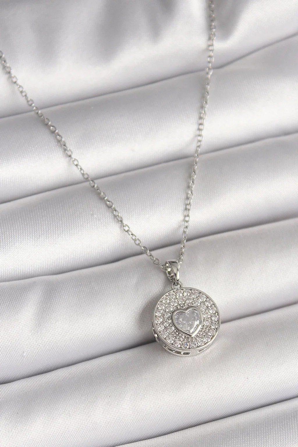 316L Çelik Gümüş Renk Zincir Zirkon Taşlı Kalp İşlemeli Madalyon Model Kadın Kolye