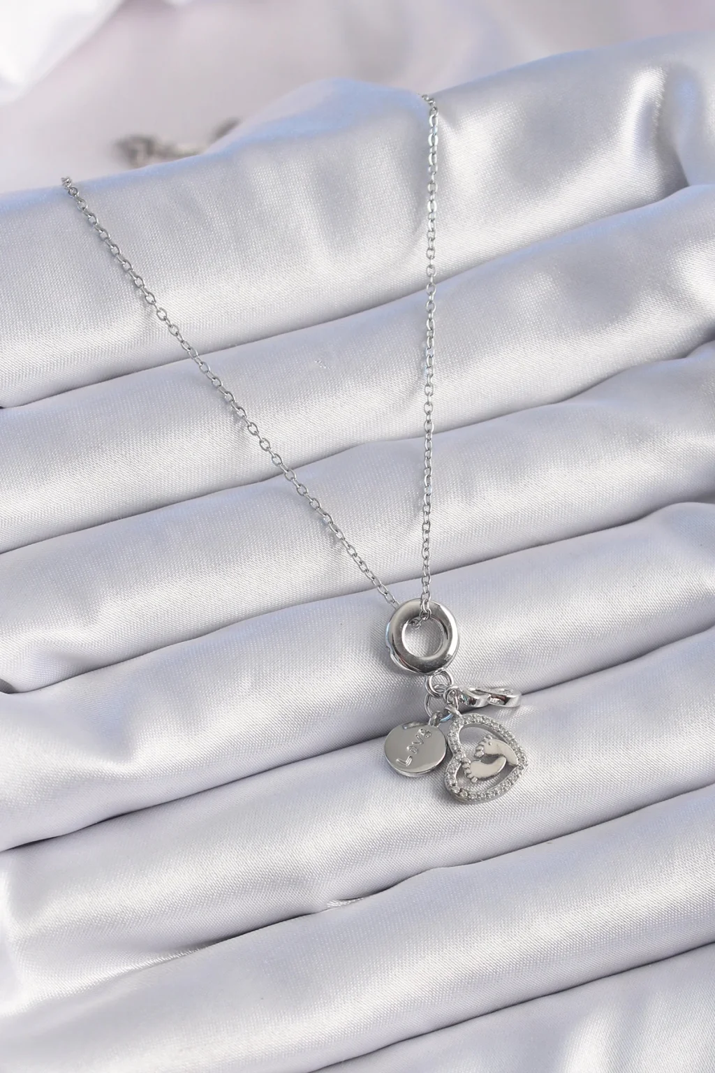 316L Çelik Gümüş Renk Zirkon Taş Detay Kalp Model Charm Kadın Kolye