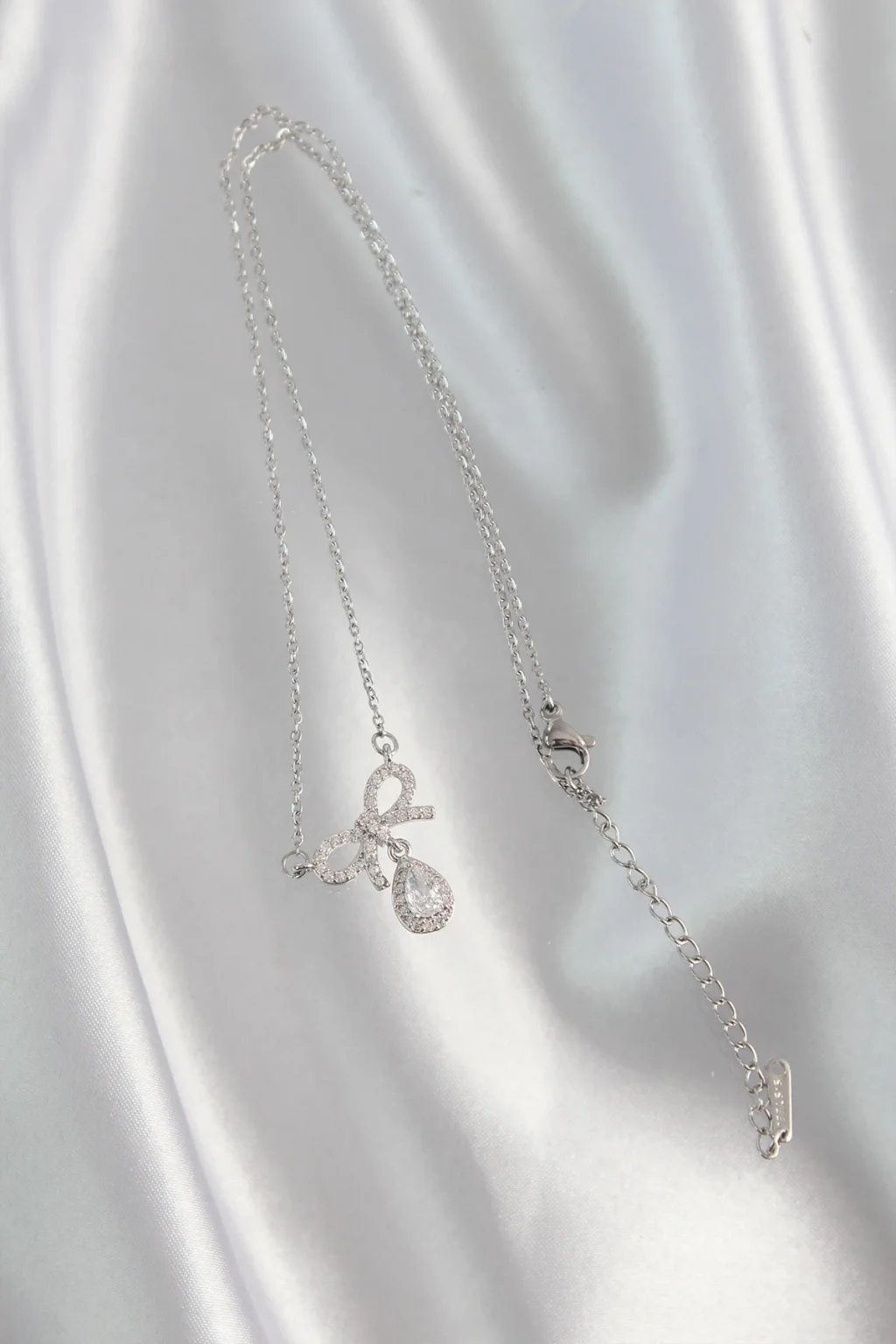 316L Çelik Gümüş Renk Zirkon Taşlı Fiyonk Detay Damla Kolye