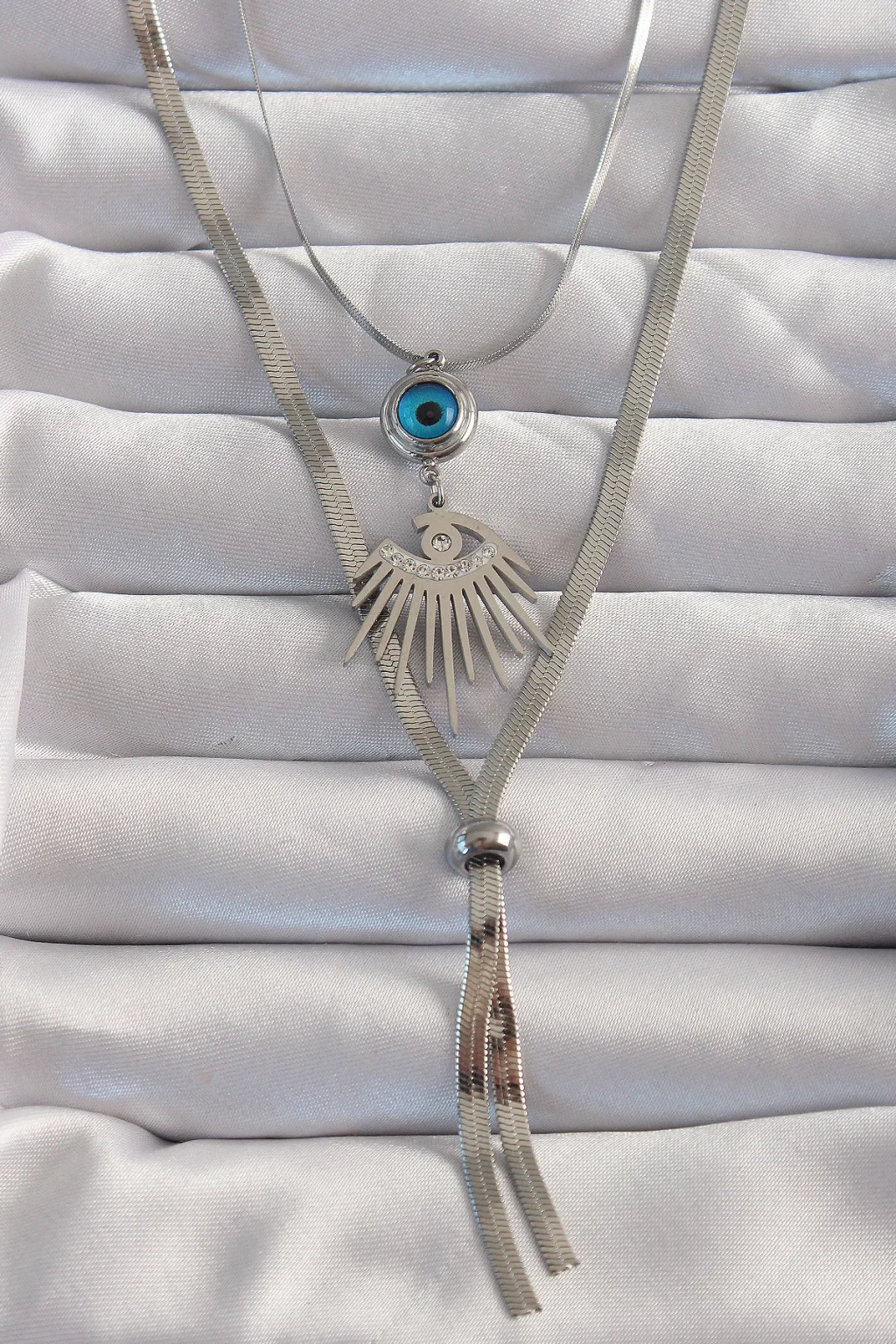 316L Çelik Gümüş Renk Zirkon Taşlı Göz Detay Nazarlı Uzun Asansör Model Kolye