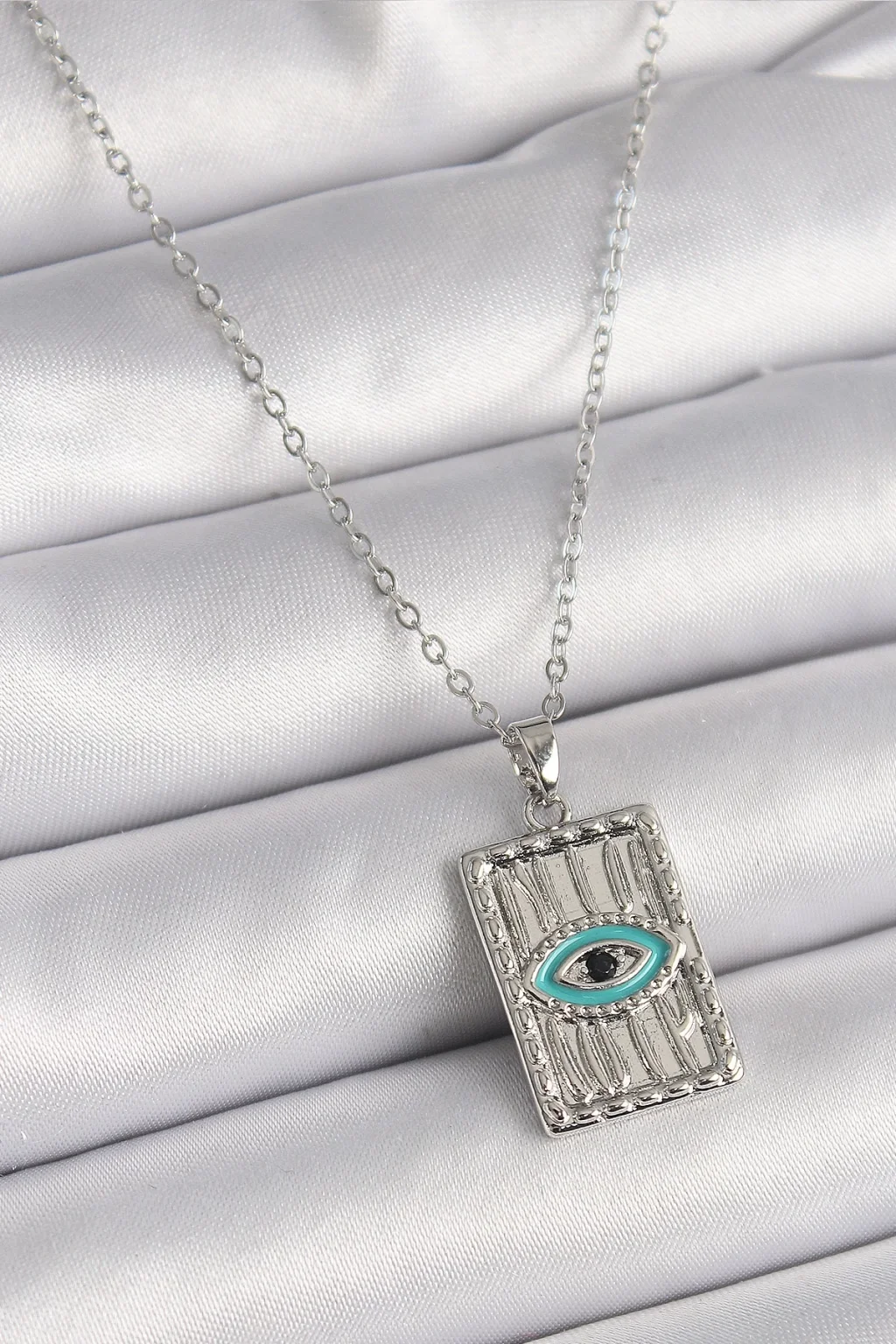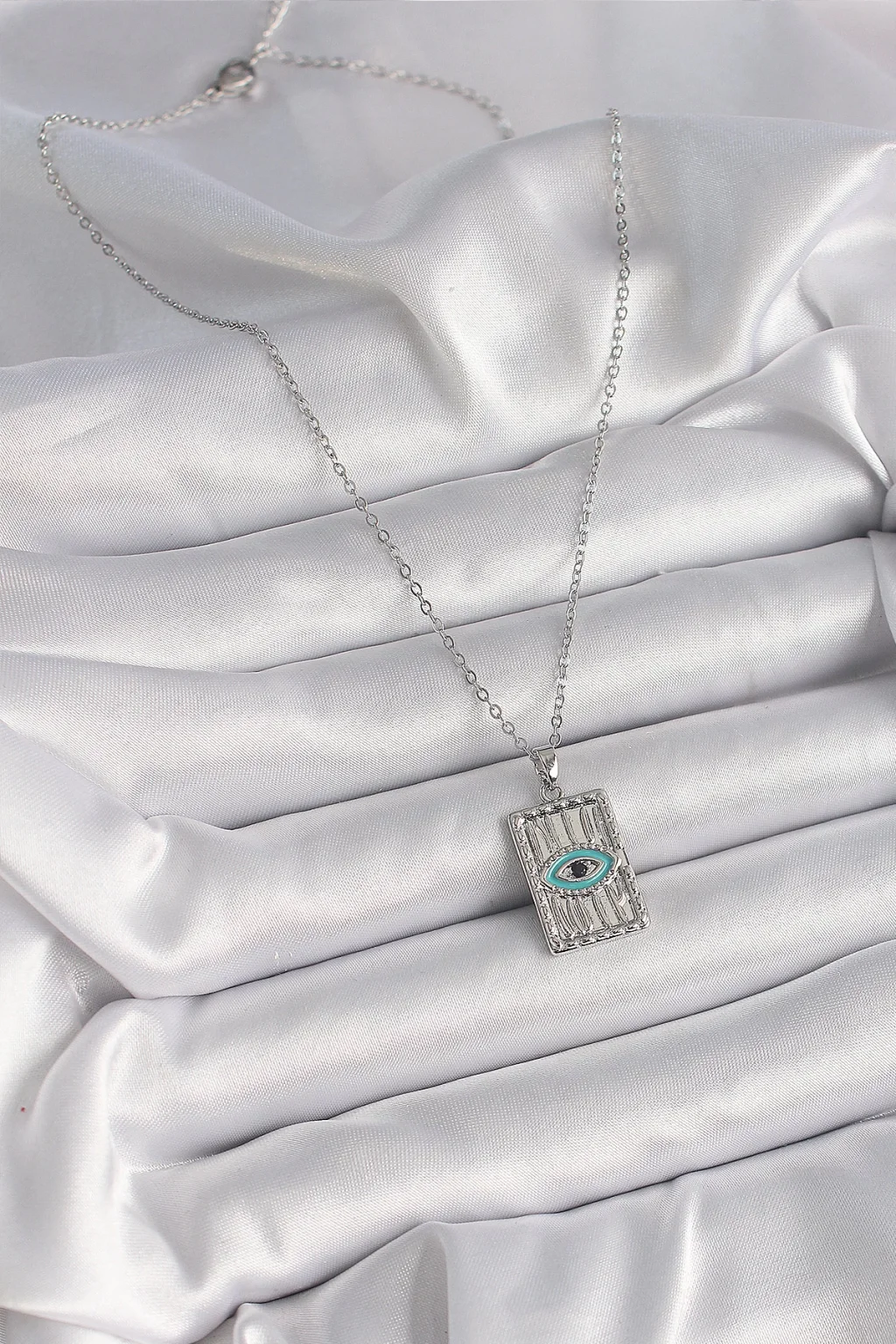 316L Çelik Gümüş Renk Zirkon Taşlı Göz İşleme Detaylı Plaka Model Kadın Kolye