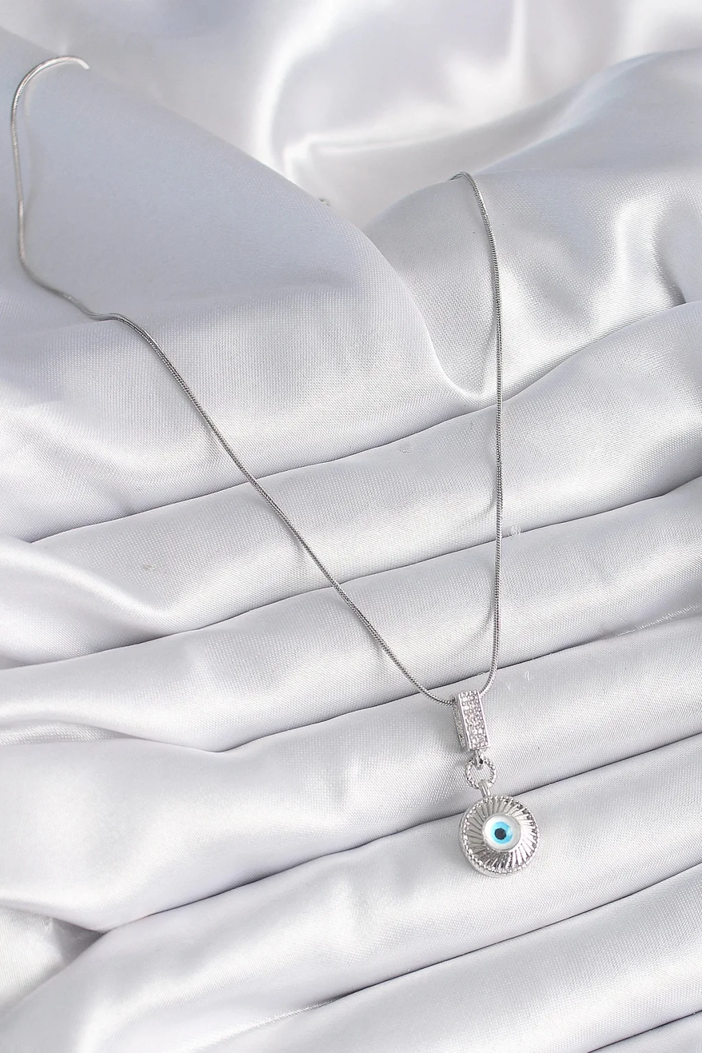 316L Çelik Gümüş Renk Zirkon Taşlı Nazar Boncuk Model Kadın Kolye