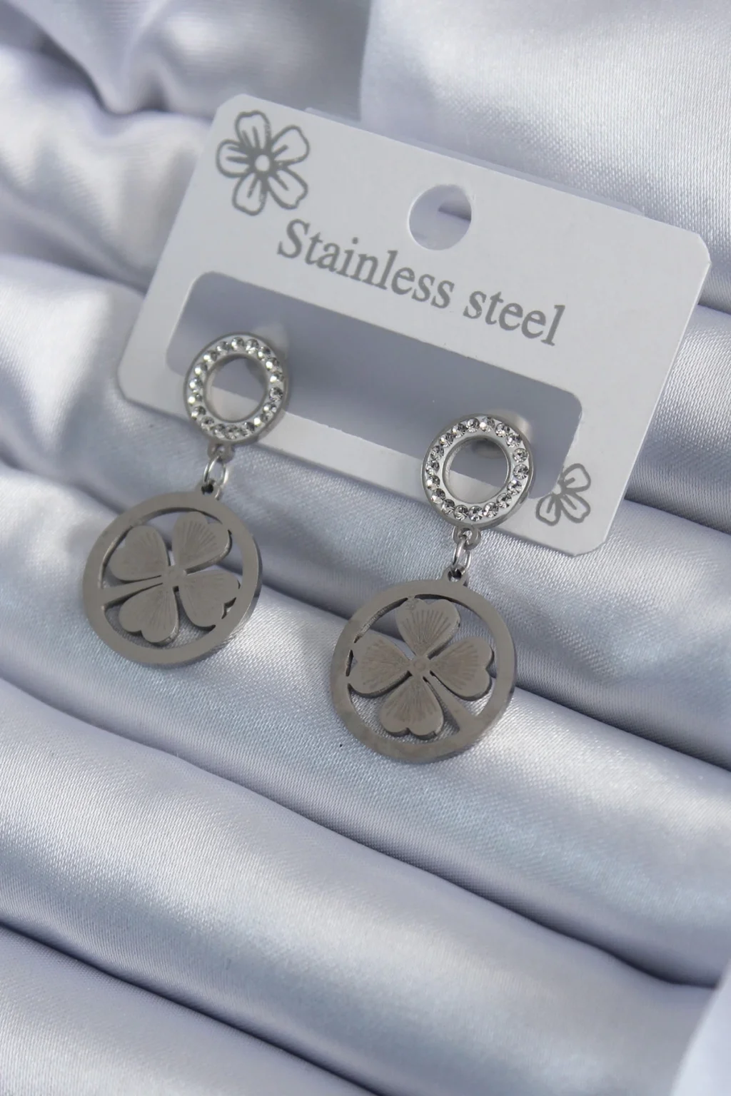316L Çelik Gümüş Renk Zirkon Taşlı Yonca Model İşleme Detay Kadın Küpe