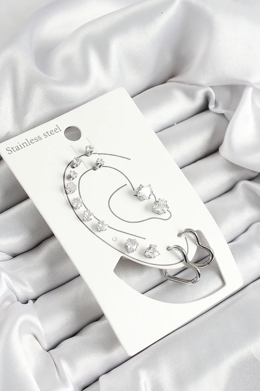 316L Çelik Kalp Figürlü Ve Zirkon Taşlı Gümüş Renk 7'li Çift Kadın Küpe Set