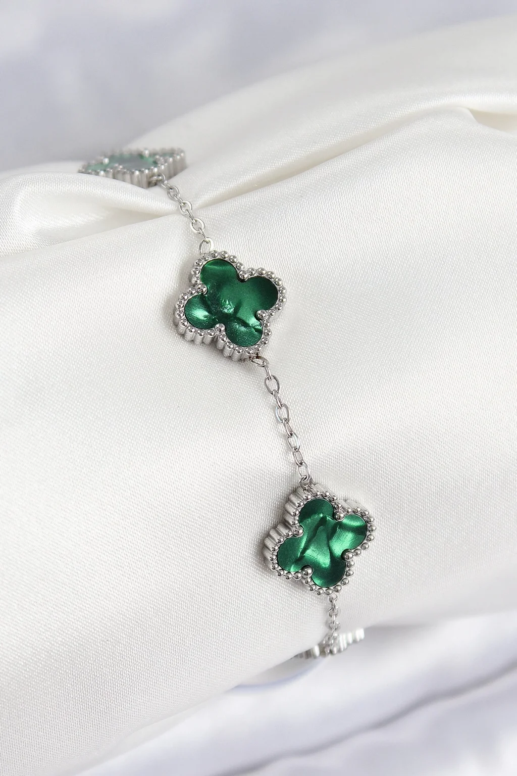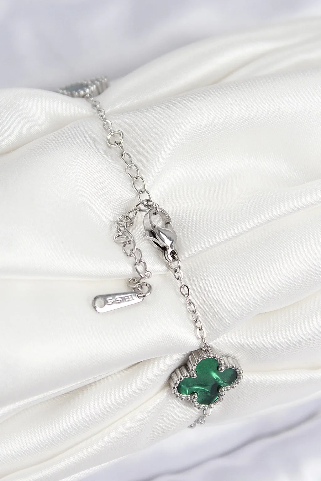 316L Çelik Sedefli Zümrüt Yeşil Gümüş Renk Yonca Kadın Bileklik