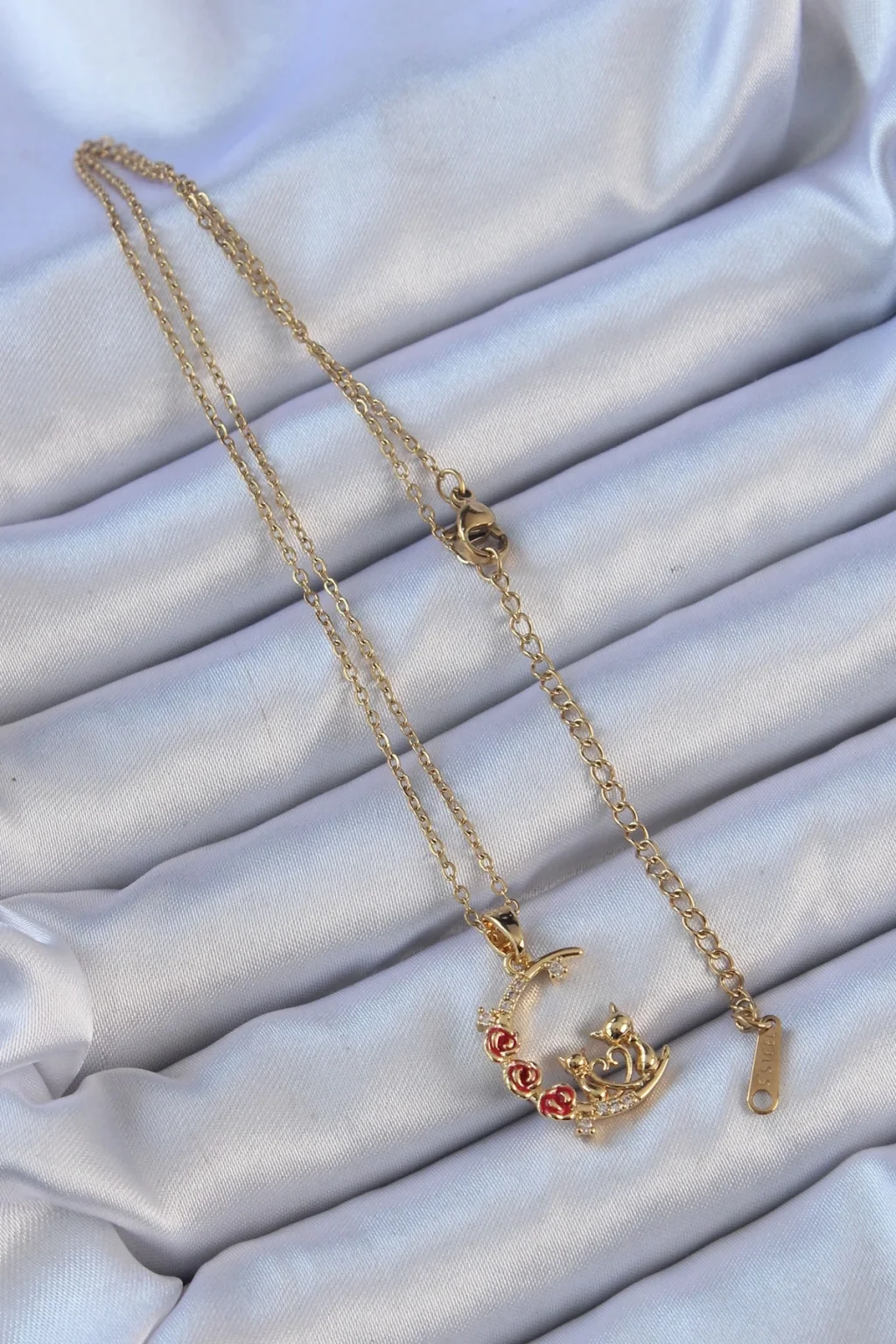 316L Çelik Zincir Altın Renk Kırmızı Gül Detay Kedi Figür Zirkon Taşlı Ay Kolye