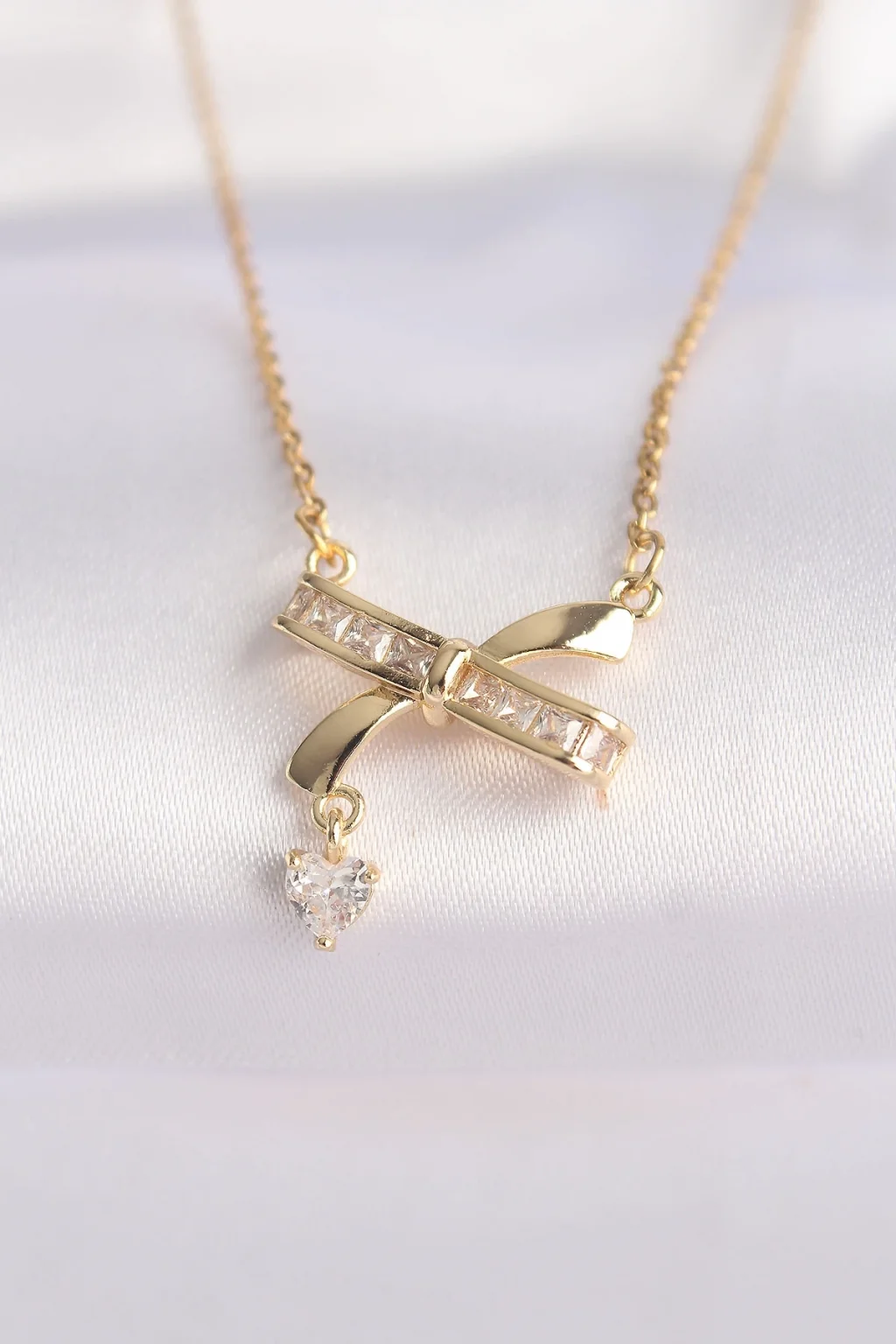 316L Çelik Zincir Altın Renk Zirkon Taşlı Kalp Detay Fiyonk Kolye