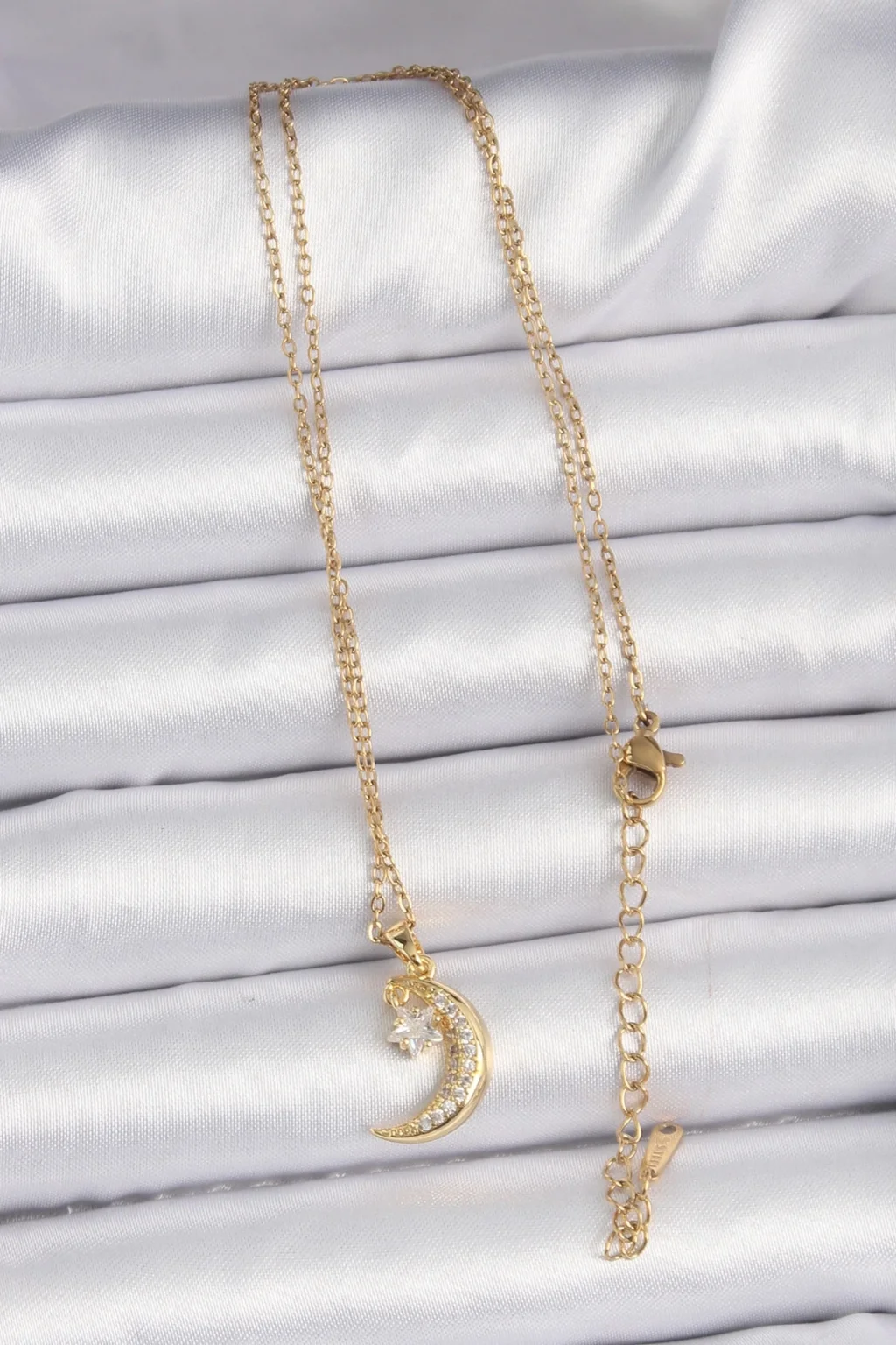 316L Çelik Zincir Altın Renk Zirkon Taşlı Sallantılı Ay Yıldız Kolye