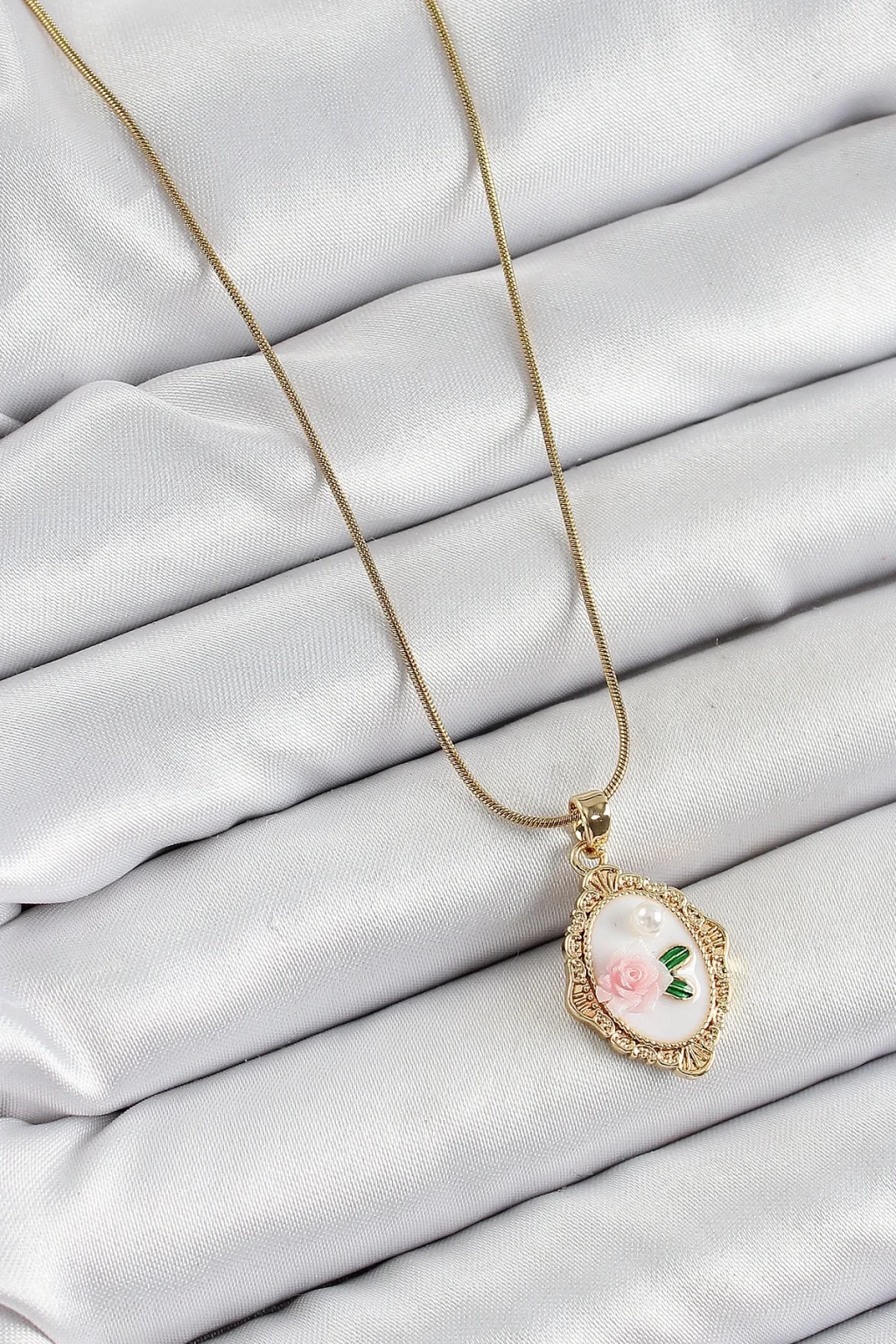 316L Çelik Zincir Beyaz Sanatsal Portre İnci Detaylı Gül Figürlü Model Gold Renk Kadın Kolye