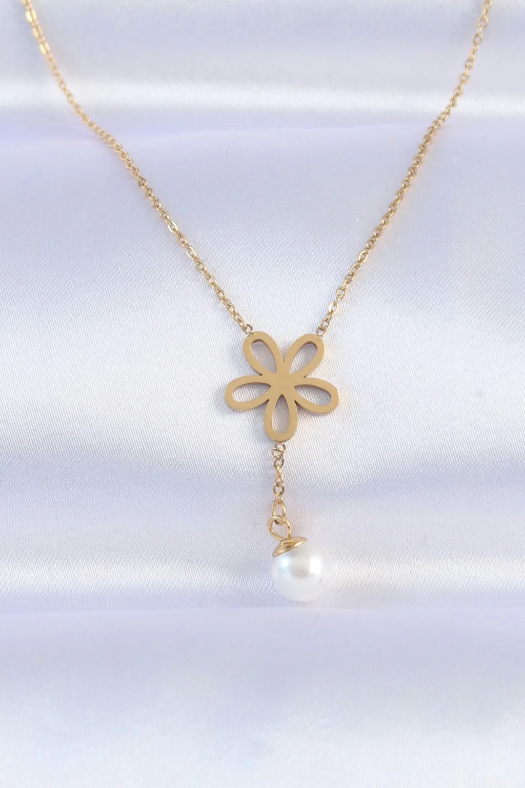 316L Çelik Zincir Gold Renk İnci Detay Çiçek Kolye