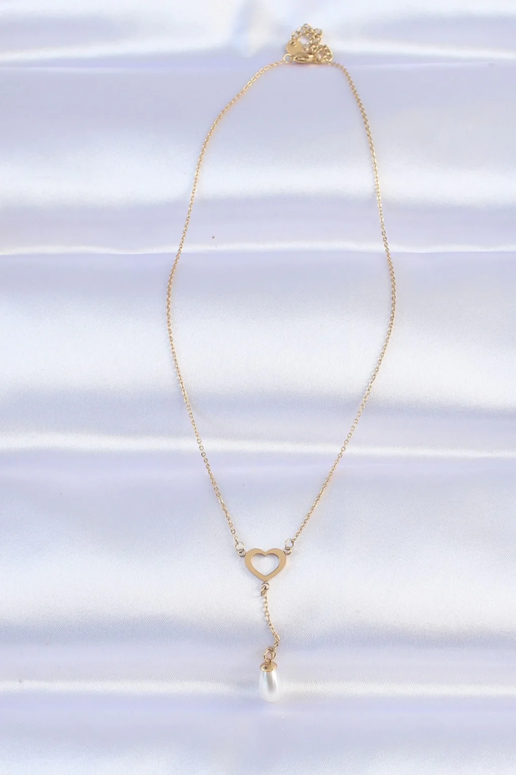 316L Çelik Zincir Gold Renk İnci Taş Detay Kalp Kolye
