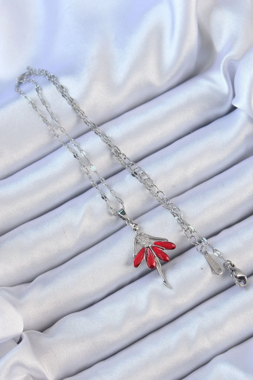 316L Çelik Zincir Gümüş Renk Kırmızı Etekli Zirkon Taşlı Balerin Kolye