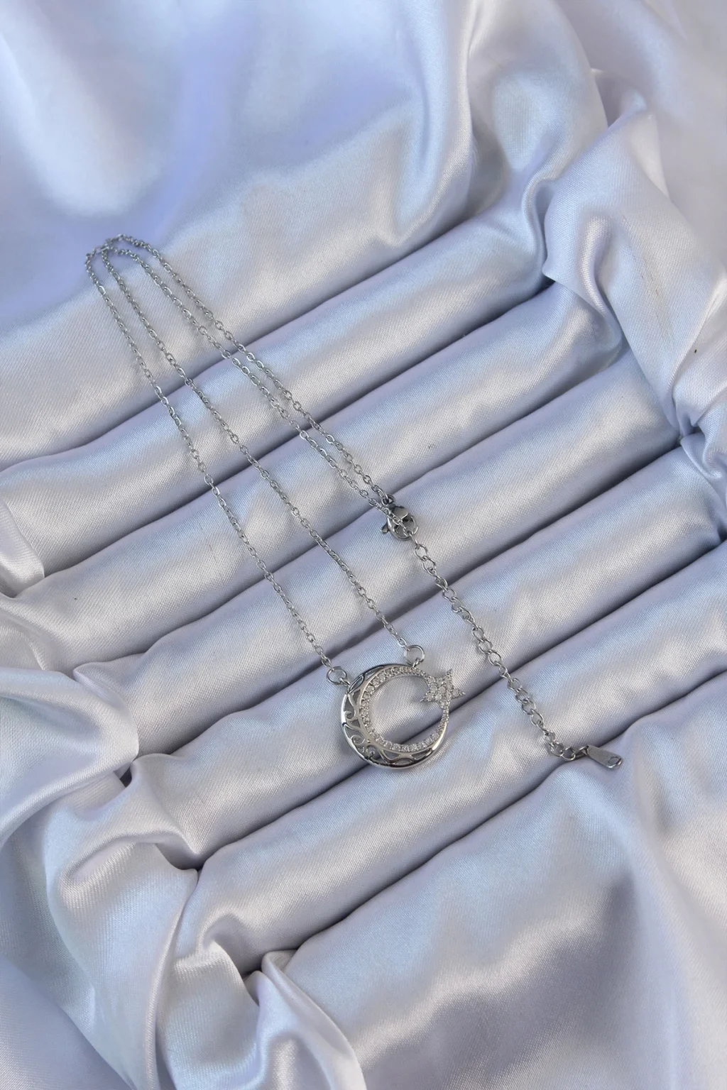316L Çelik Zincir Gümüş Renk Zirkon Taşlı Motifli Ay Yıldız Kolye