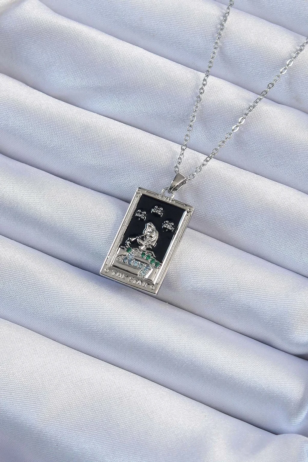 316L Çelik Zincir Gümüş Renk Zirkon Taşlı Siyah Mineli Kız Figürlü Tarot Kolye