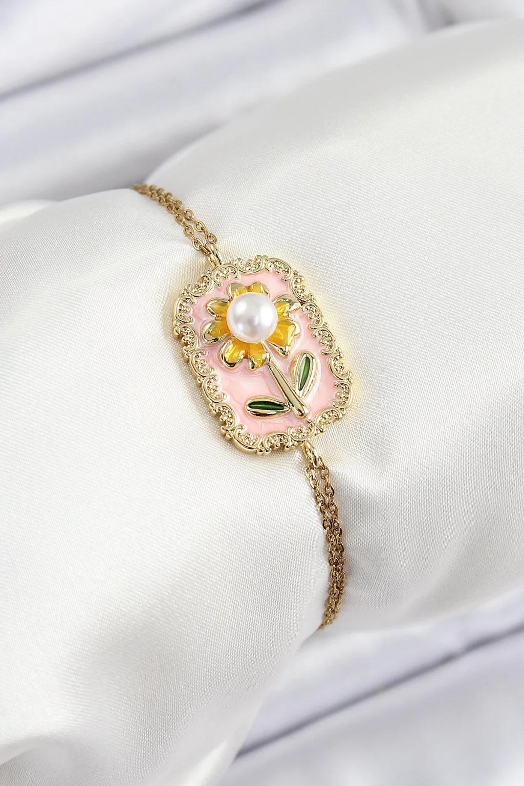 316L Çelik Zincir Pembe Mineli Sanatsal Portre İnci Detaylı Papatya Model Gold Renk Kadın Bileklik