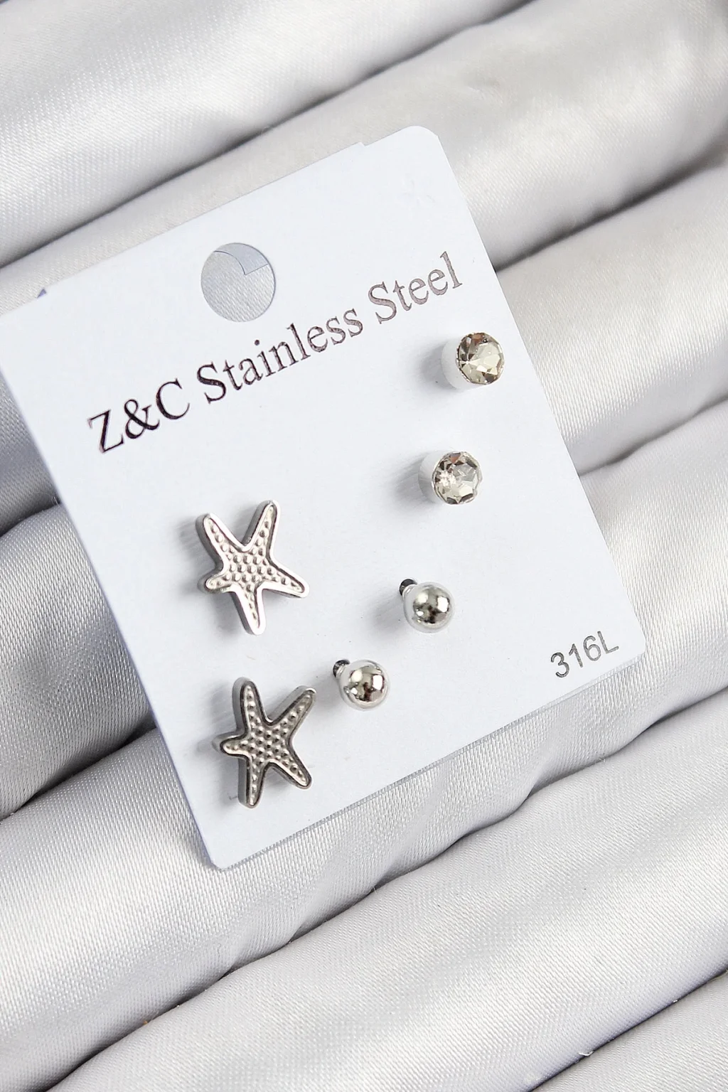 316L Çelik Zirkon Taşlı Deniz Yıldızı Model Gümüş Renk Kadın Set Küpe