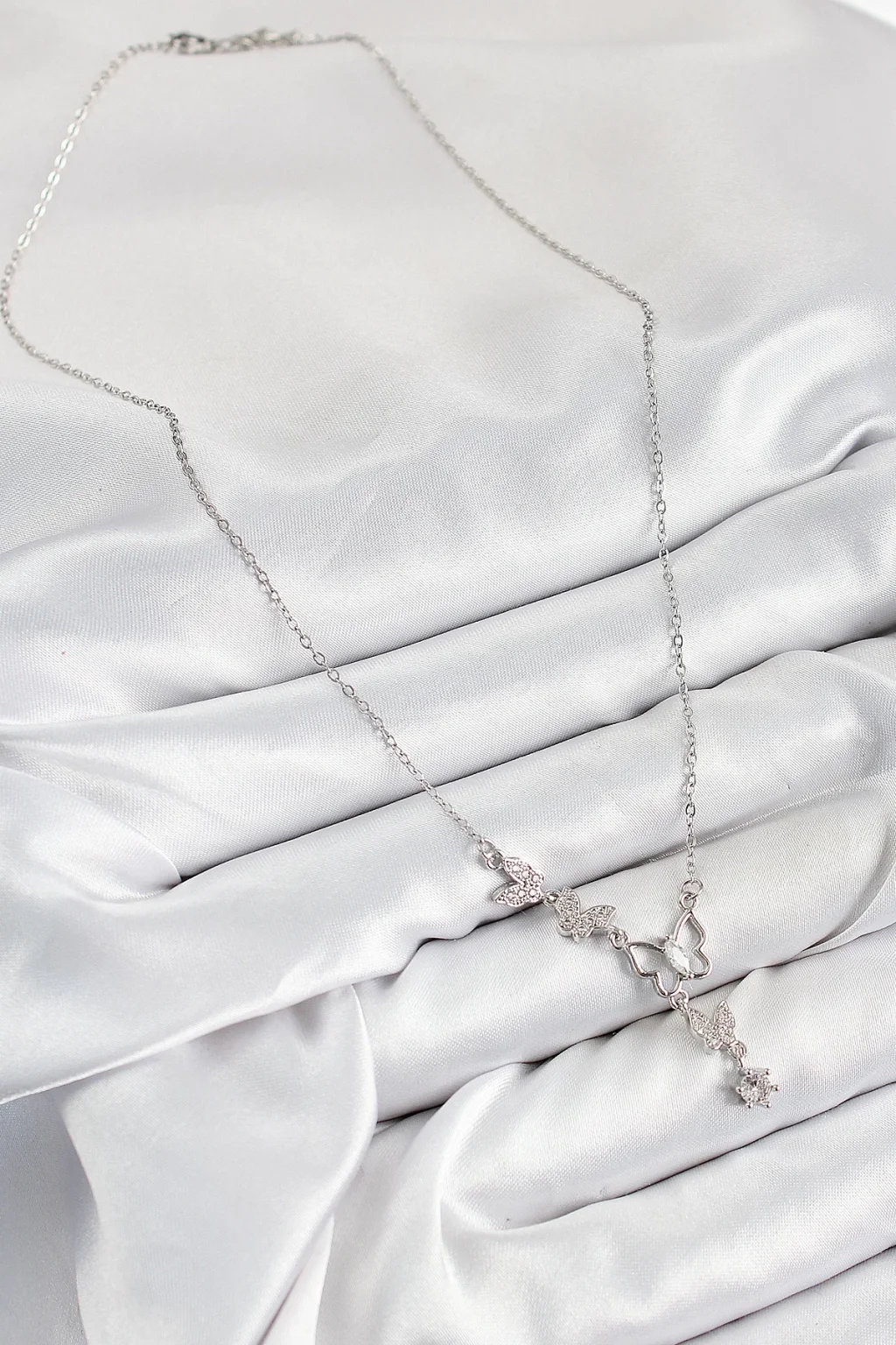 316L Çelik Zirkon Taşlı Kelebek Model Gümüş Renk Kadın Kolye
