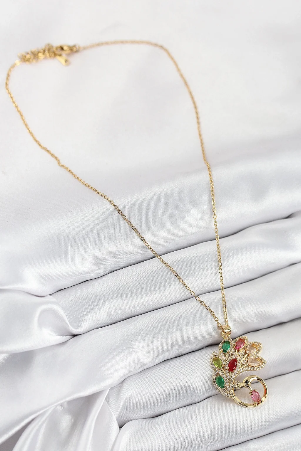 316L Çelik Zirkon Taşlı Tavus Kuşu Model Gold Renk Kadın Kolye